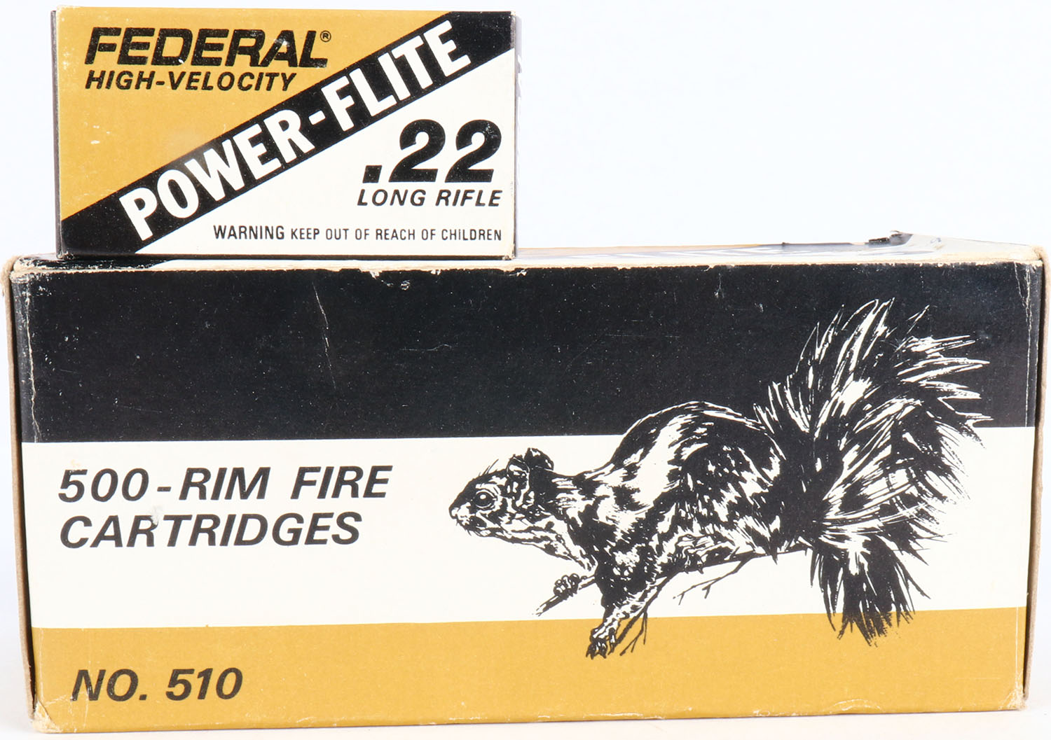 Federal, Power-Flite, .22 Long Rifle, High-Velocity, Full, 500rds. 1pc. Black gold & white brick, brick is solid with excellent color, very minor staining, top has been written on, some edge & corner wear, end flaps are solid, inside boxes are minty. Grade: Excellent - Value: 20 to 100