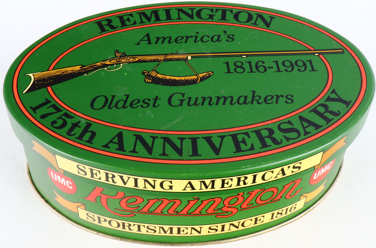 Remington, .22 Long Rifle, High Velocity, 175th Anniversary Collectors tin, 2pc. Full, 325rds., Green box & tin, tin is MINT with minty color, ammo is mint, no box - tin only. Grade: MINT - Value: 10 to 50