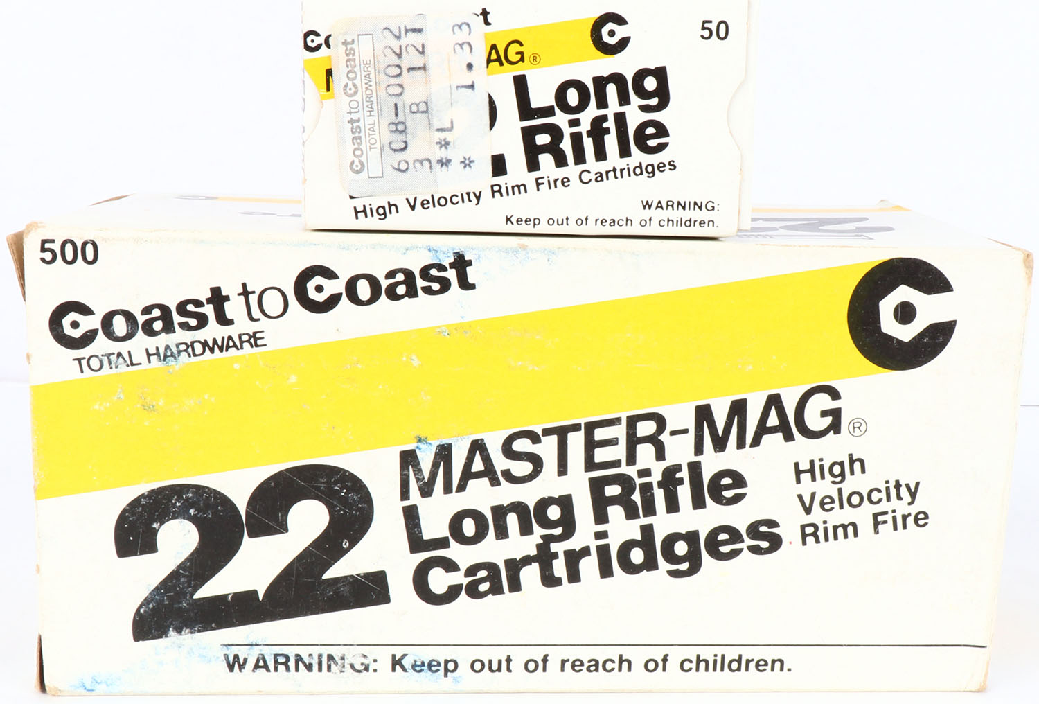 Coast to Coast, Master-Mag, .22 Long Rifle, High Velocity, Full, 500rds. 1pc. White black & yellow brick, brick is solid with excellent color, some shelf wear, minor corner wear, very minor edge wear, end flaps are solid, inside boxes are minty with original retail price tags on them. Grade: Excellent + - Value: 50 to 150