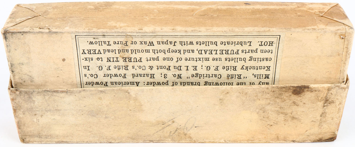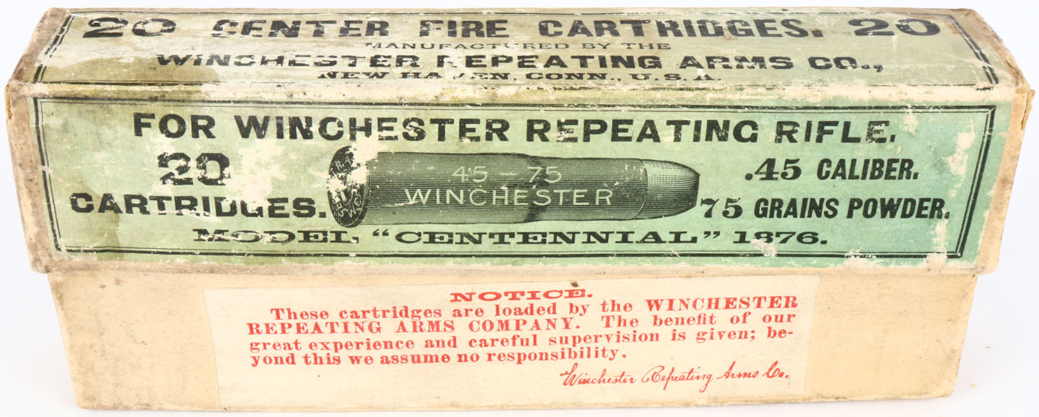 Winchester, .45-75 Model ''Centennial'' 1876, Full, 2pc. Buff box with green label, box is solid with good to very good color, some age soiling & color fading, shelf wear, some edge & corner wear, labels are intact, ammo is excellent. Grade: Very Good + - Value: 200 to 600