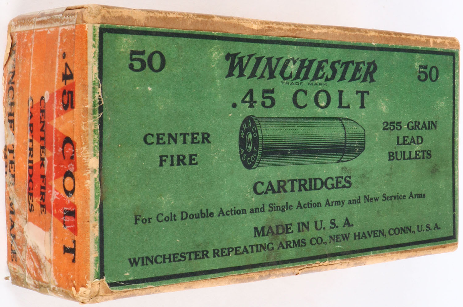 Winchester, Center Fire Cartridges, .45 Colt, 255 Grain Lead Bullets, Full of incorrect ammo (western), 2pc, buff box with green & orange wraparound label, box is solid with excellent color, some age soiling, tape on left end corners, some edge & corner wear, ammo is excellent. Grade: Very Good ++ - Value: 20 to 60