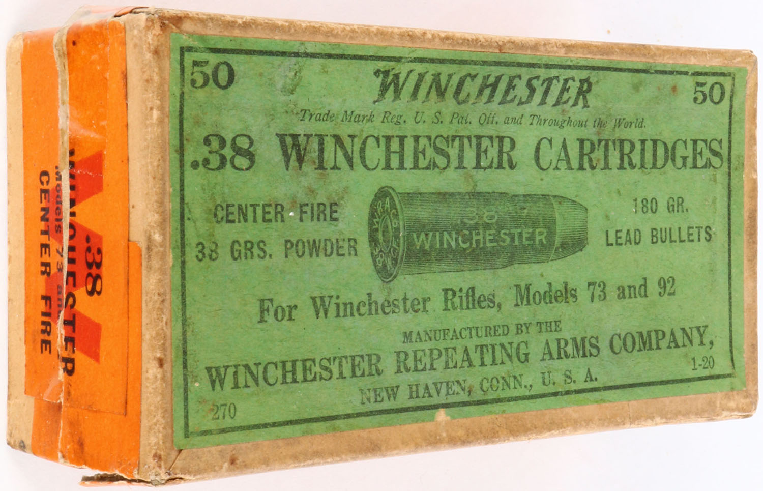 Winchester, .38 Winchester, 180 Gr. Lead Bullets, Partial 21rds., 2pc. Buff box with green top & orange side sealing labels, box is solid with very good to excellent color, minor age soiling, some color fading on top, vertical seam splits to all corners of lid, minor corner wear, very minor edge wear, labels are intact, ammo is very good. Grade: Very Good + - Value: 8 to 40