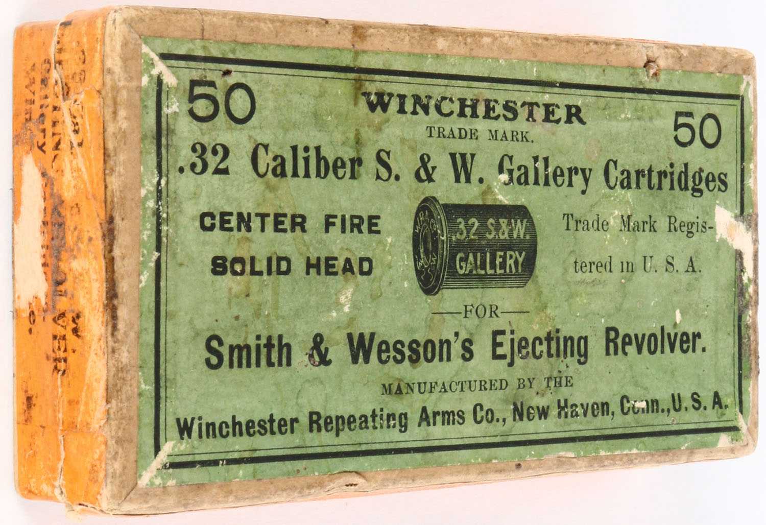 Winchester, .32 Smith & Wesson Gallery Cartridges, Smith & Wesson's Ejecting Revolver, Full & Half-Sealed, 2pc. Buff box with green top & orange side sealing labels, side sealing label is sealed on left end and back side, box is solid with very good color, age soiling, minor shelf wear, minor edge & corner wear, labels are intact, ammo appears very good. Grade: Excellent - Value: 30 to 90