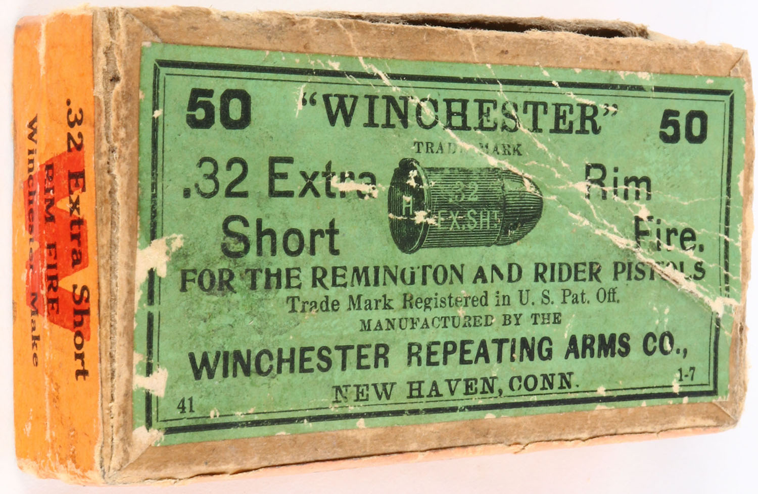 Winchester, .32 Extra Short Rim Fire, Full, 2pc. Buff box with green top & orange side sealing labels, box is sealed but has 2 seam splits to back side and right edges of lid, excellent color, very minor age soiling, some shelf wear, lid is creased diagonally, edge & corner wear, ammo is good. Grade: Very Good - Value: 100 to 1000