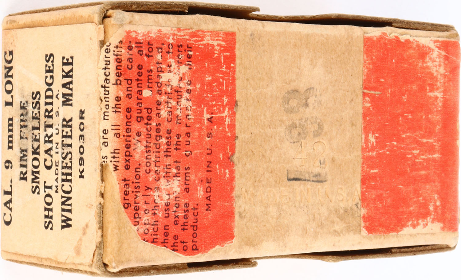 Winchester, 9mm Long Shot Cartridges, Rim Fire, Full, 2pc. Buff box with red wraparound label, box is solid with good color, color fading, minor shelf wear, very minor corner wear, edges are mostly crisp, label is intact, ammo is excellent. Grade: Excellent - Value: 20 to 80