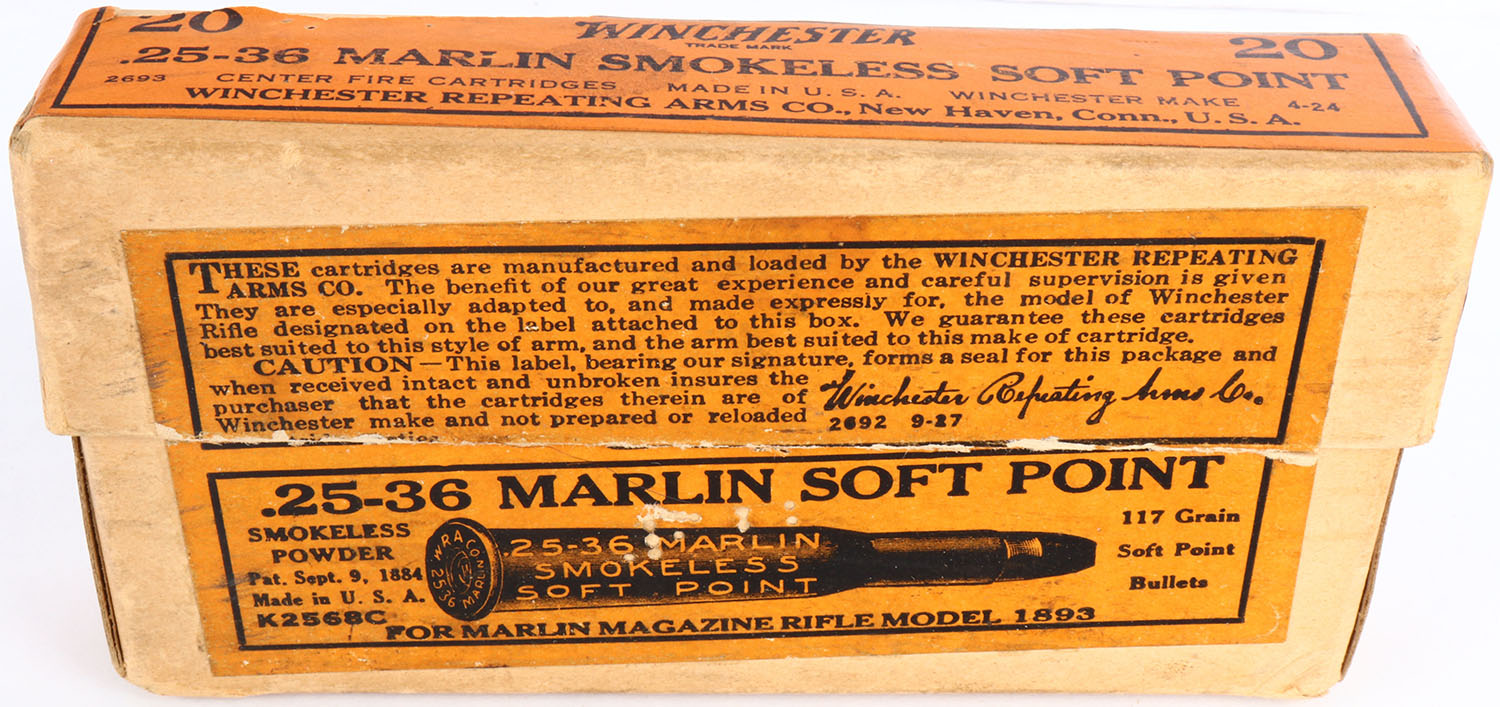 Winchester, .25-36 Marlin, Smokeless, 117 Grain Soft Point Bullets, Full, 2pc. Buff box with orange labels, box is solid with excellent color, minor age soiling, very minor edge & corner wear, corner ding on bottom left corner, labels are intact, ammo is excellent. Grade: Excellent + - Value: 200 to 400