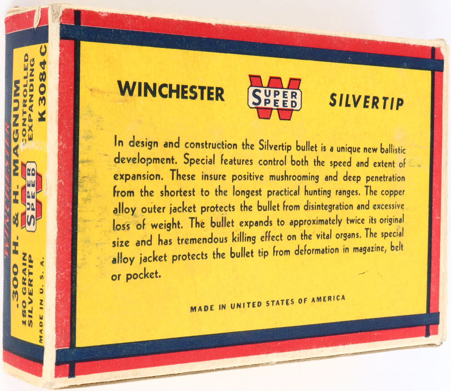 Winchester, Silvertip, .300 H&H Magnum, 180 Grain Controlled Expanding Bullet, Full, 1pc. Yellow blue & red bear box, box is solid with excellent color, very minor shelf wear on bottom, very minor edge & corner wear, end flaps are solid, ammo is excellent. Grade: Excellent + - Value: 200 to 400