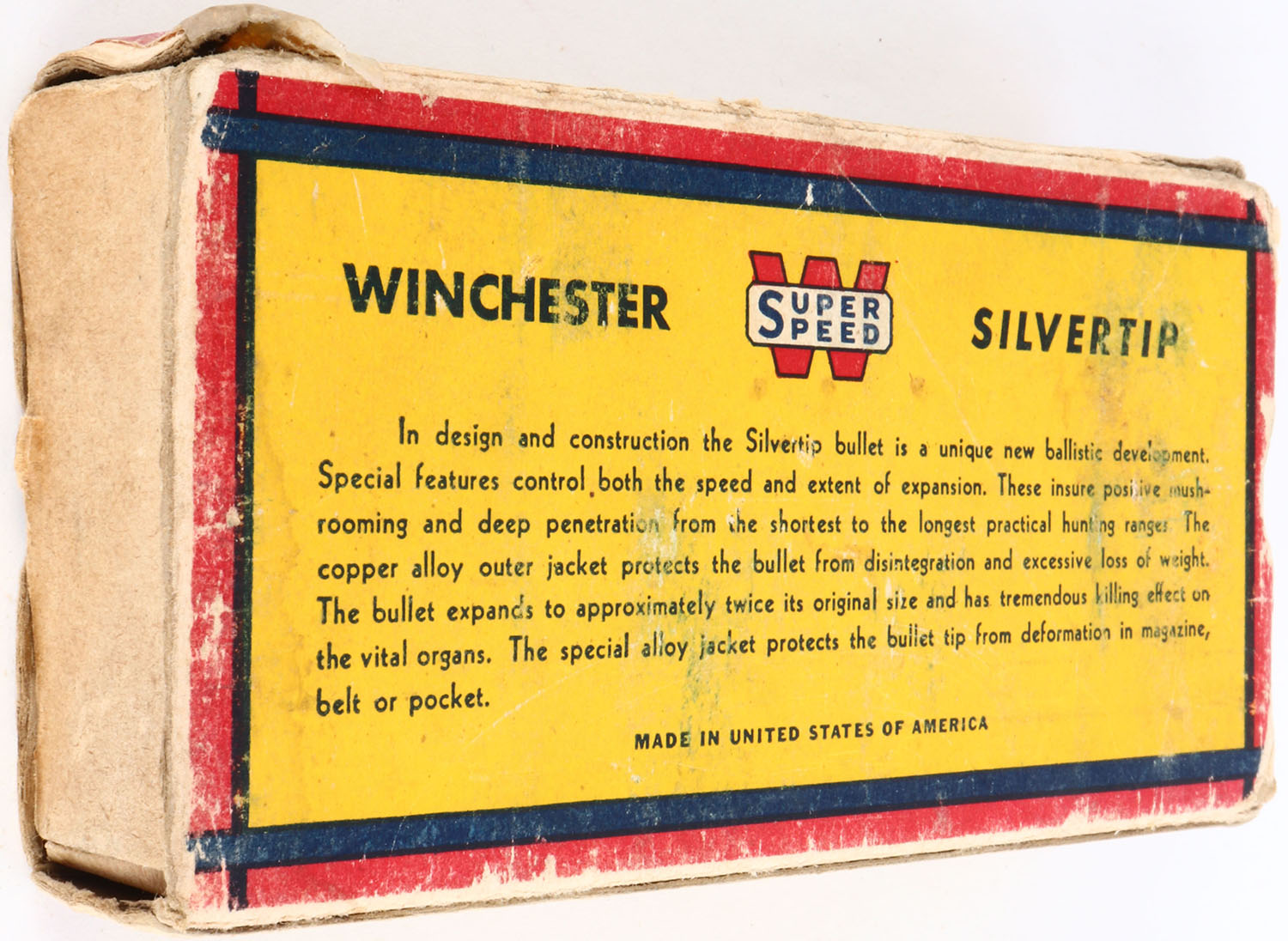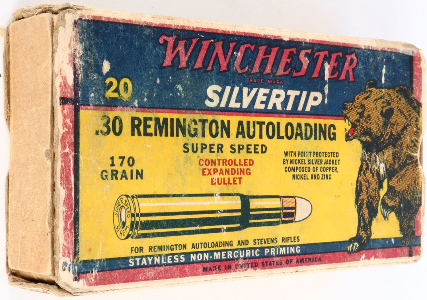Winchester, Silvertip, .30 Remington Autoloading, 170 Grain Controlled Expanding Bullet, Partial 16rds. Correct, 1pc. Yellow blue & red box, box is missing both end flaps, good color, age soiling, some color fading, some shelf wear, edge & corner wear, ammo is excellent. Grade: Good ++ - Value: 10 to 50