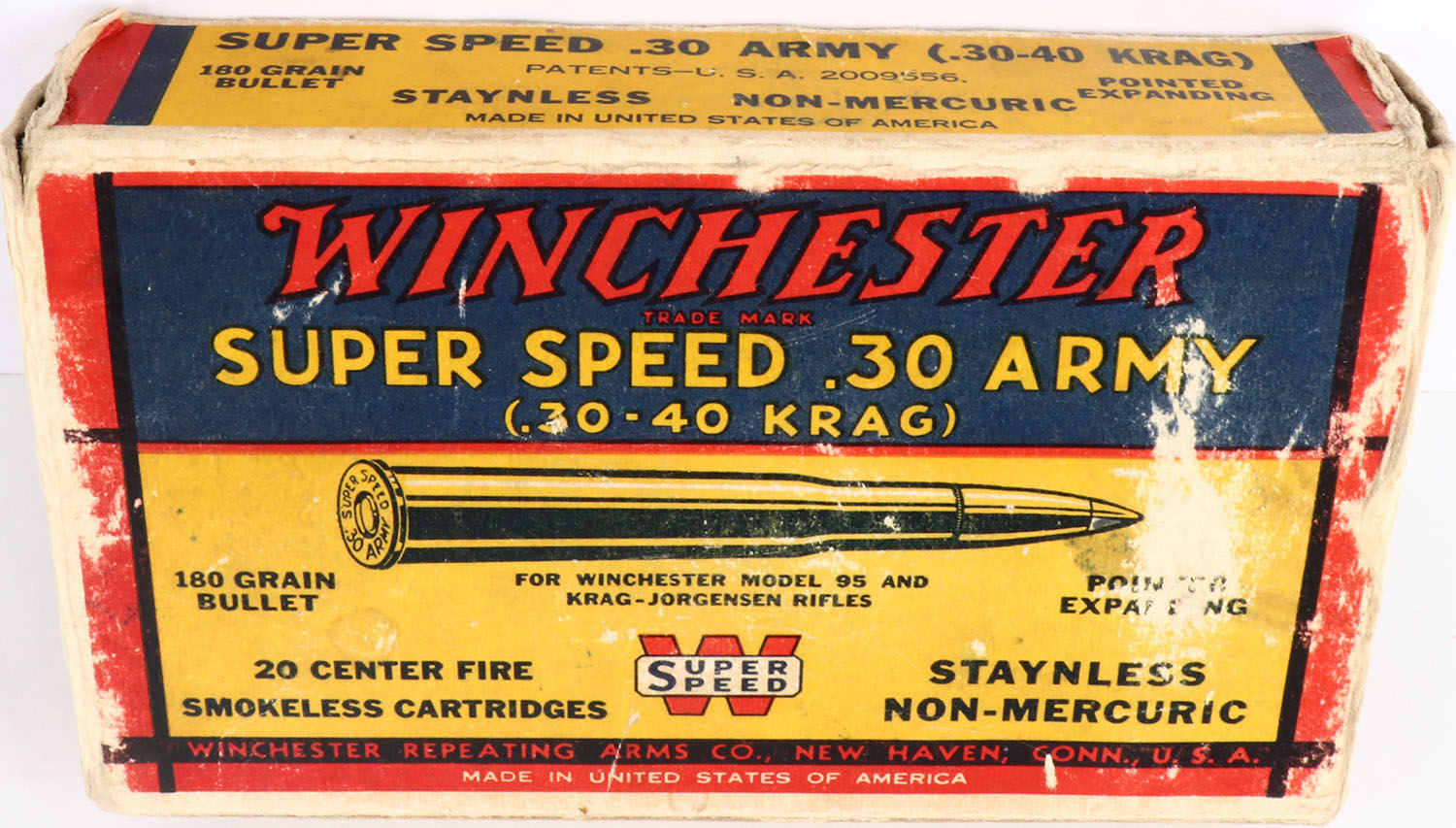 Winchester, Super Speed, .30 Army (.30-40 Krag), 180 Grain Pointed Expanding, Partial 10rds., 1pc. Yellow blue & red box, box is solid with very good to excellent color, minor age soiling, shelf wear, edge & corner wear, end flaps are solid, ammo is excellent. Grade: Very Good + - Value: 10 to 50