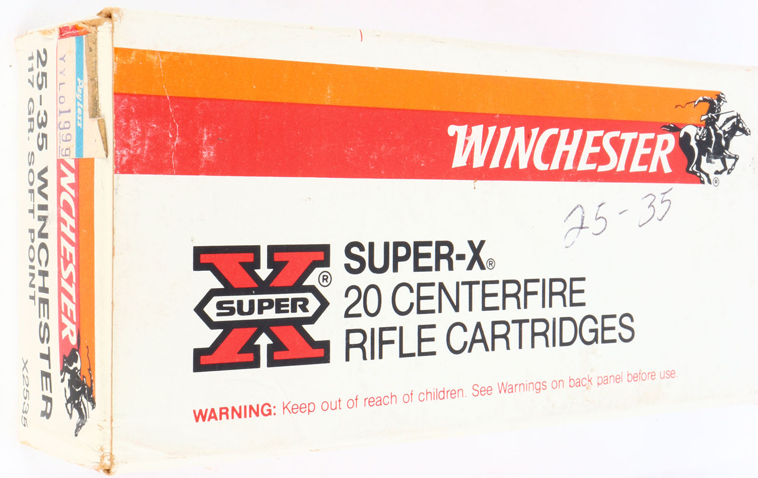 Winchester, Super-X, .25-35 Winchester, 117 Grain Soft Point, Full, 1pc. Gray red & orange box, box is solid with excellent color, minor shelf & corner wear, edges are mostly crisp, end flaps are solid, top has been written on, ammo is excellent. Grade: Excellent. - Value: 40 to 120