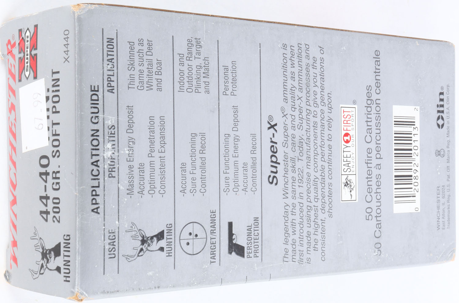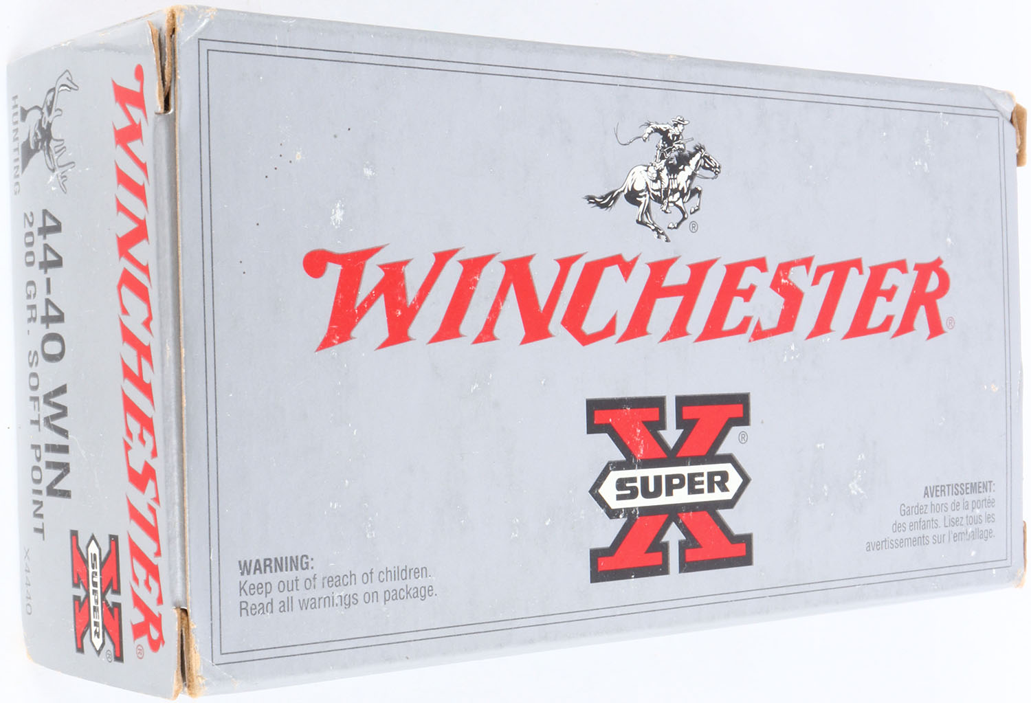 Winchester, .44-40 Winchester, 200 Grain Soft Point, Full, 1pc. Silver & red box, box is solid with excellent color, some shelf wear, minor corner wear, edges are crisp, end flaps are solid, price tag sticker on right end flap, ammo is excellent. Grade: Excellent + - Value: 50 to 150