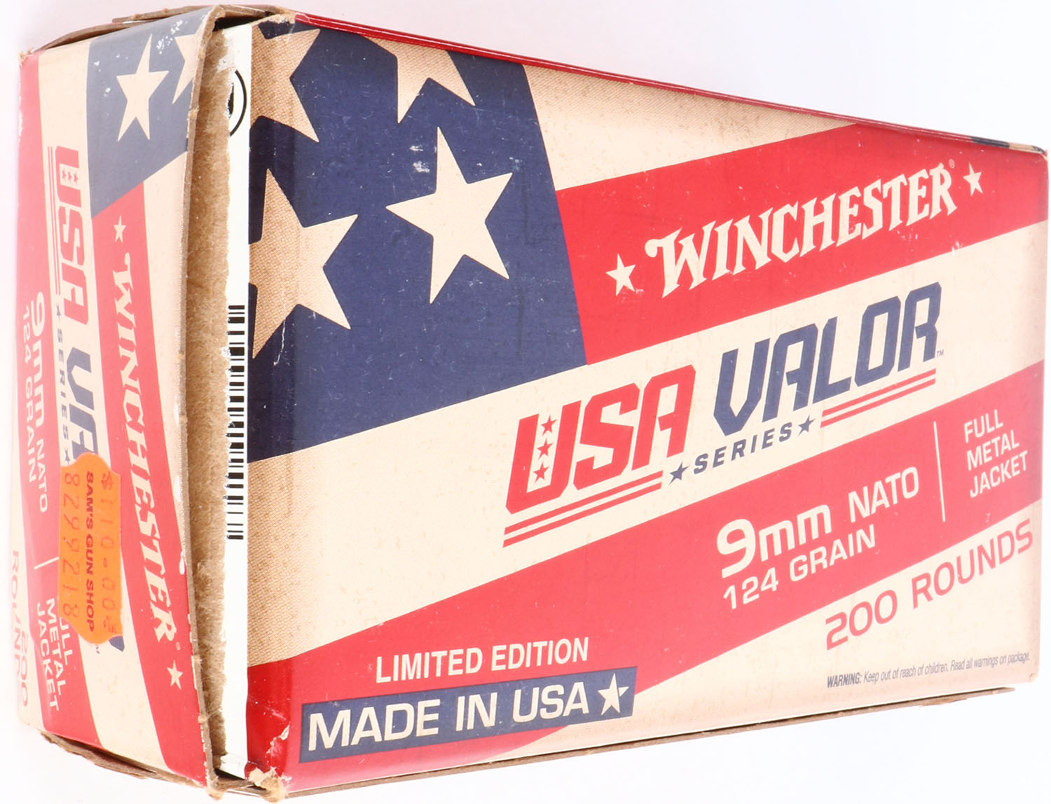Winchester, USA Valor, 9mm Nato, 124 Grain Full Metal Jacket, FULL & SEALED, 200rds., 1pc. Tan red & blue box, box is near mint with minty color, factory edge has unadhered on left end, corners are sharp, edges are crisp, ammo appears mint. Grade: Excellent + - Value: 30 to 90