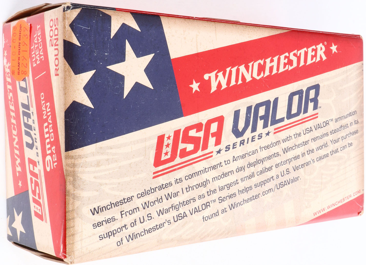 Winchester, USA Valor, 9mm Nato, 124 Grain Full Metal Jacket, FULL & SEALED, 200rds., 1pc. Tan red & blue box, box is near mint with minty color, corners are sharp, edges are crisp. Grade: Excellent ++ - Value: 30 to 90