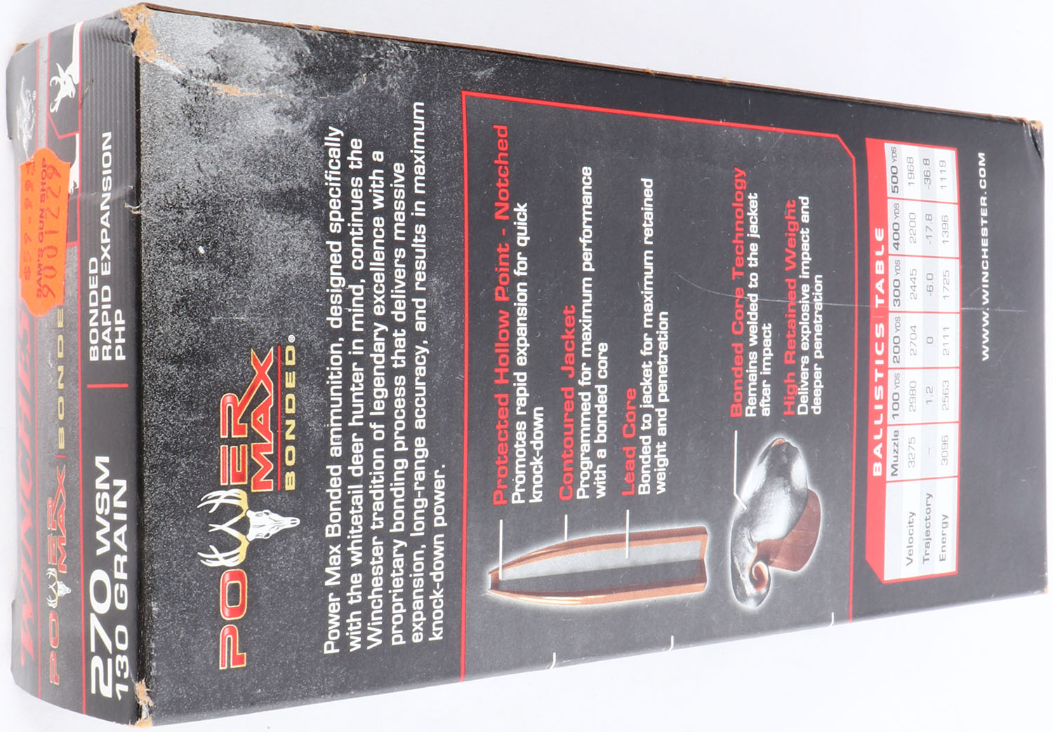 Winchester, Power Max, .270 WSM, 130 Grain Bonded Rapid Expansion PHP, Full, 1pc. Black & red box, box is solid with minty color, minor corner wear, edges are crisp, end flaps are solid, ammo is excellent. Grade: Excellent ++ - Value: 30 to 90