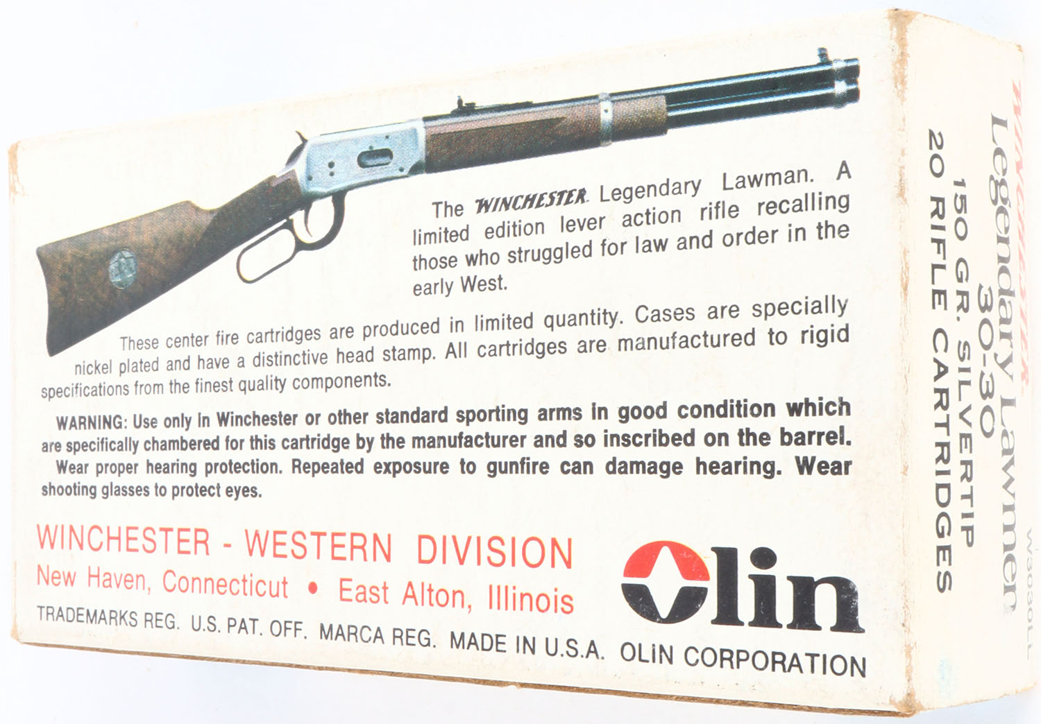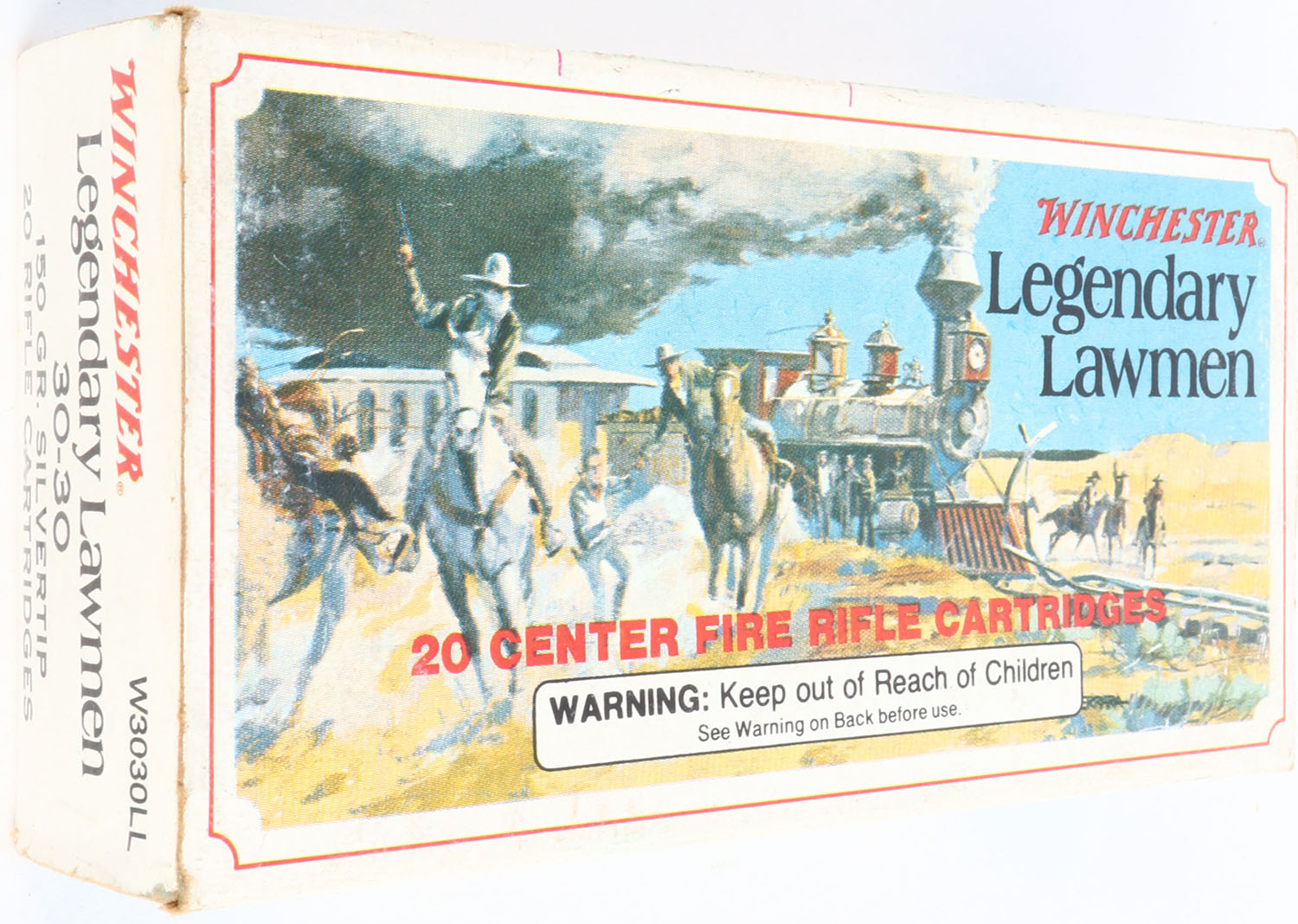 Winchester, Legendary Lawmen, .30-30 Winchester, 150 Grain Silvertip, Full, 1pc. Multi-colored box, box is solid with excellent color, very minor age soiling & corner wear, edges are mostly crisp, end flaps are solid, ammo is excellent. Grade: Excellent + - Value: 30 to 90