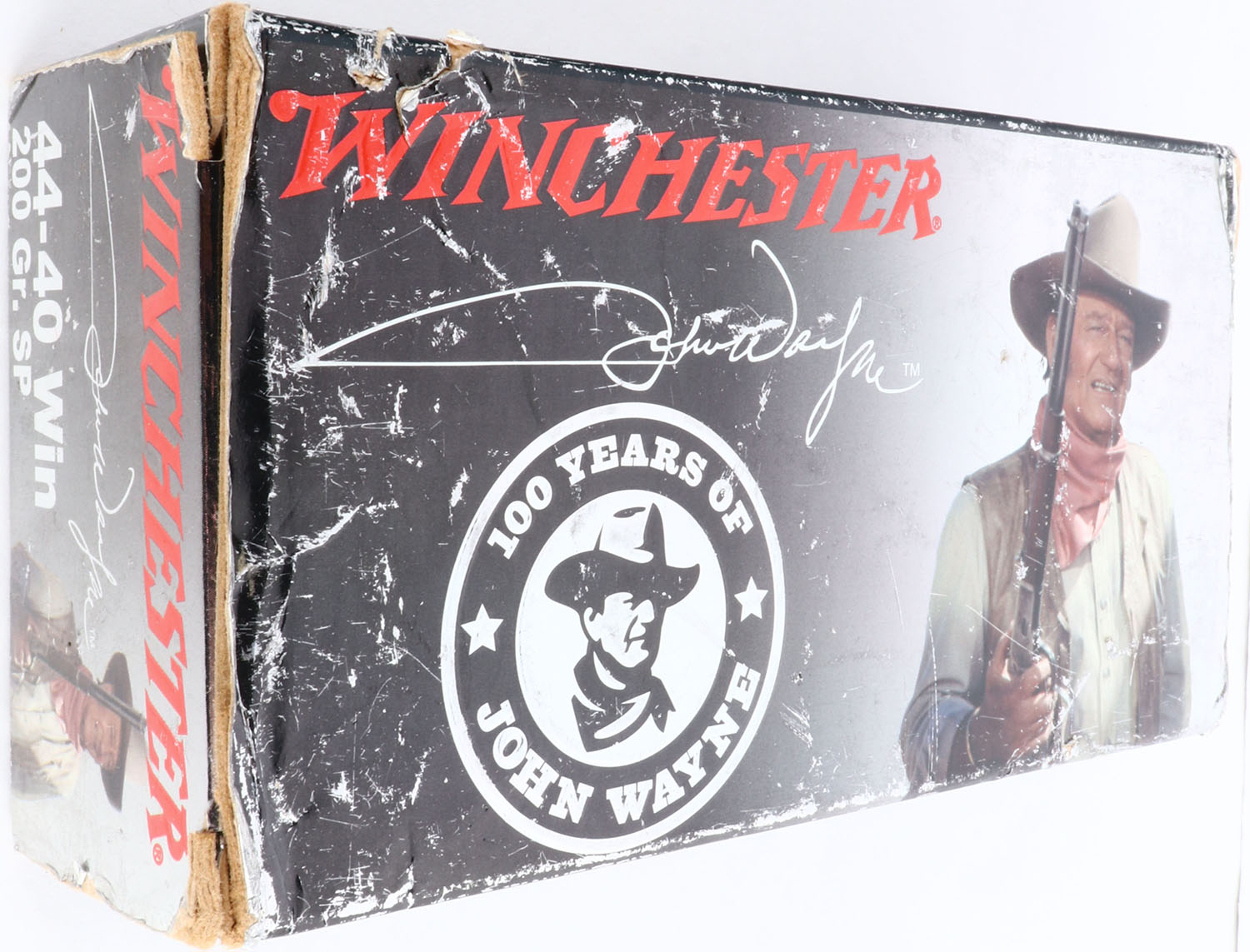 Winchester, John Wayne, .44-40 Winchester, 200 Grain Soft Point, Full, 1pc. Black & silver box featuring The Duke, box is solid with excellent color, shelf wear, edge & corner wear, end flaps are solid, ammo is excellent. Grade: Very Good + - Value: 40 to 120