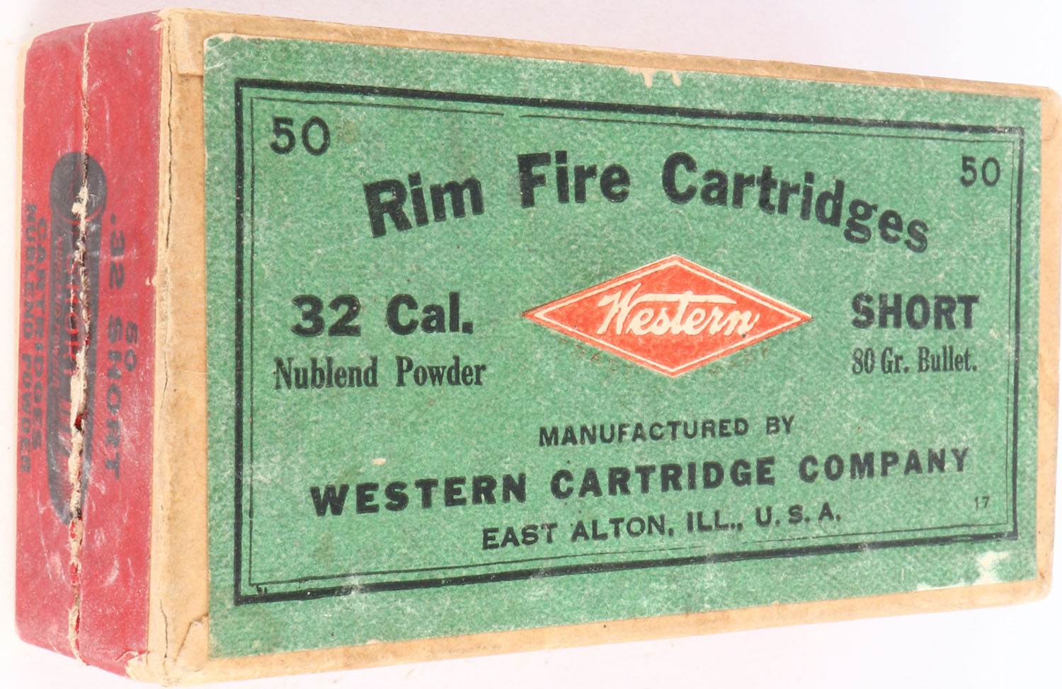 Western, Rim Fire Cartridges, .32 Short, Nublend Powder, 80 Grain Bullet, FULL & SEALED, 2pc. Buff box with green top & red side sealing labels, box is solid with excellent color, very minor age soiling & corner wear, edges are mostly crisp, labels are intact. Grade: Excellent + - Value: 50 to 150