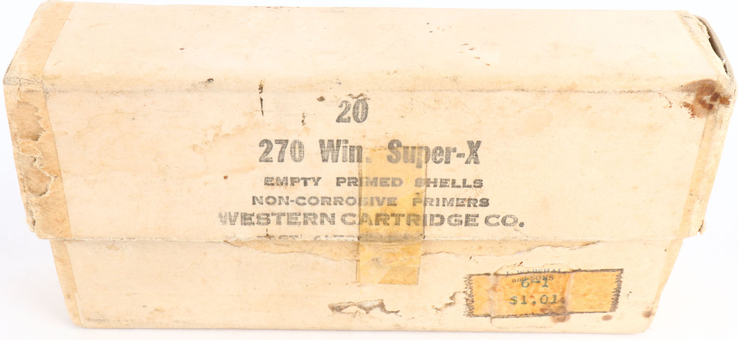 Western, .Super-X, .270 Winchester, Empty Primed Shells, Non-Corrosive Primers, Full, 2pc. Buff box with black stamp, box is solid with very good color, age soiling, some edge & corner wear, tape on front, ammo is excellent. Grade: Very Good + - Value: 10 to 50