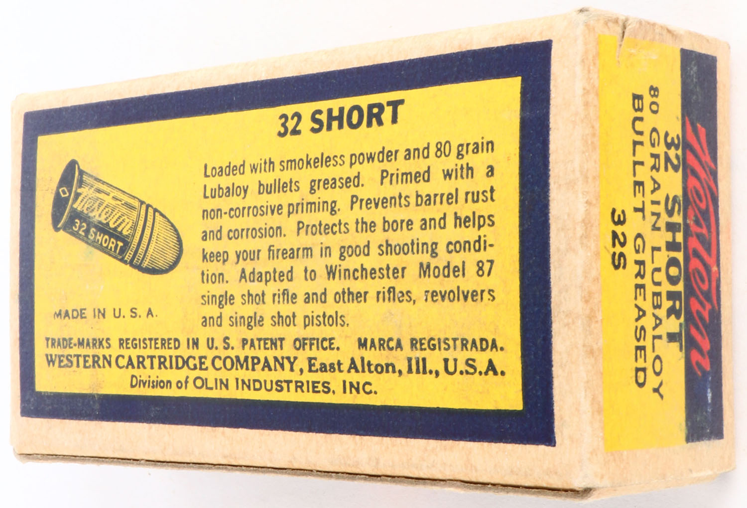 Western, Lubaloy, .32 Short Rim Fire, 80 Grain Bullet Greased, Full, 1pc. Yellow blue & red box, box is solid with excellent color, minor age soiling, top has been written on, very minor corner wear, edges are crisp, end flaps are solid, ammo is minty. Grade: Excellent + - Value: 80 to 240