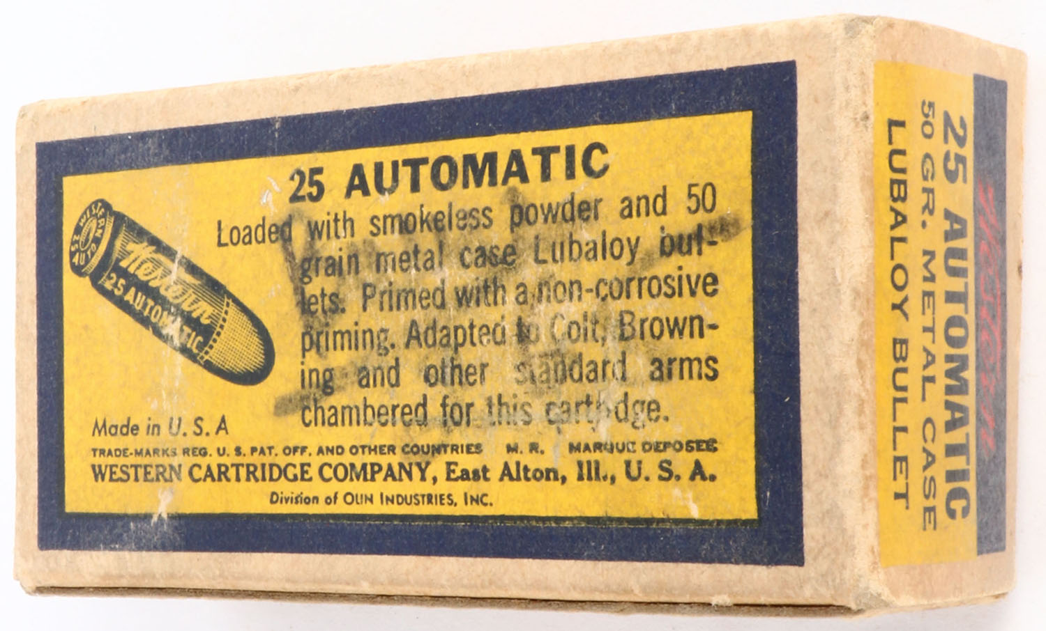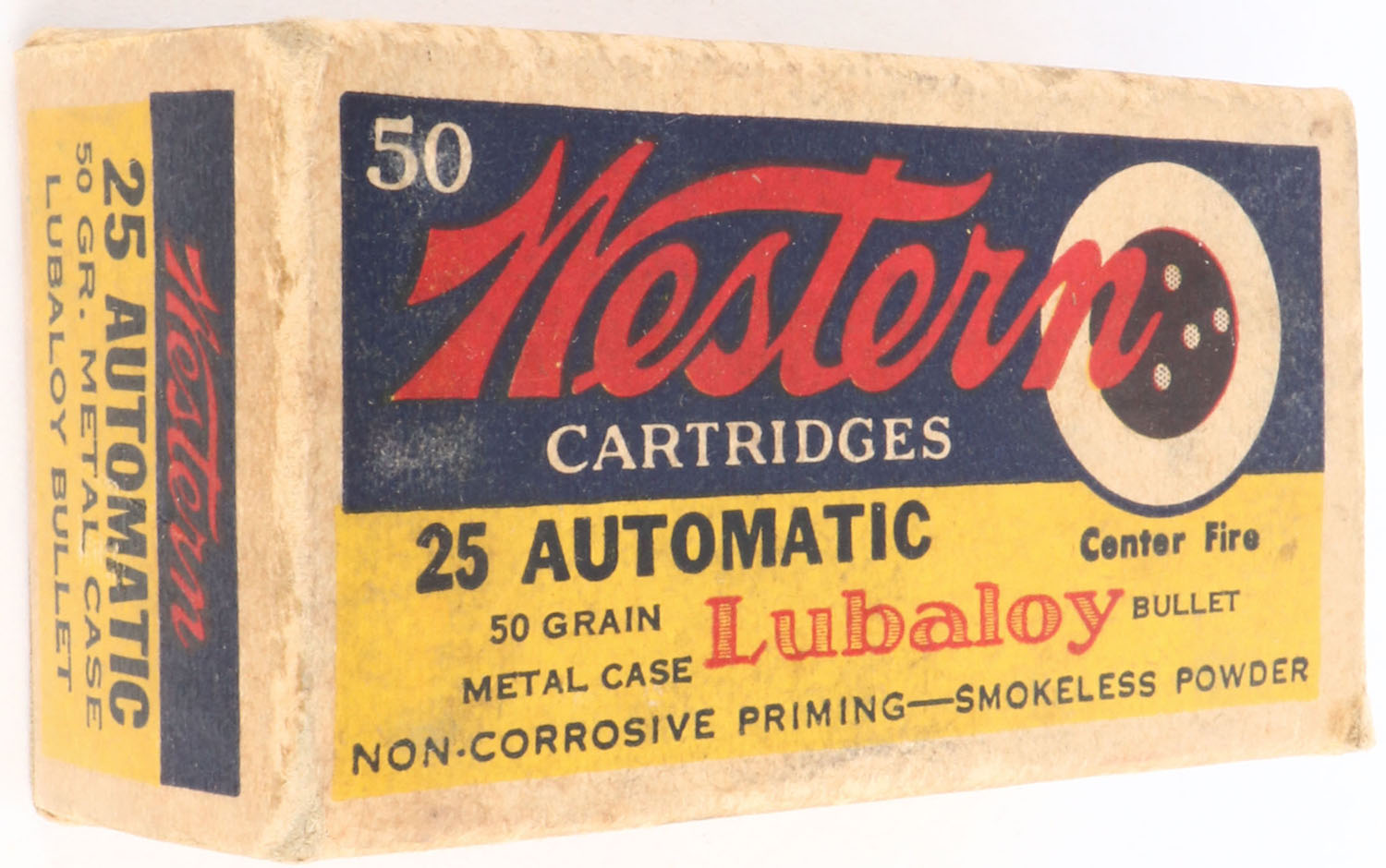 Western, Lubaloy, .25 Automatic, 50 Grain Metal Case, Full, 1pc. Yellow blue & red box, box is solid with very good to excellent color, some age soiling, very minor shelf wear, some corner wear, minor edge wear, end flaps are solid, ammo is excellent. Grade: Excellent - Value: 20 to 60