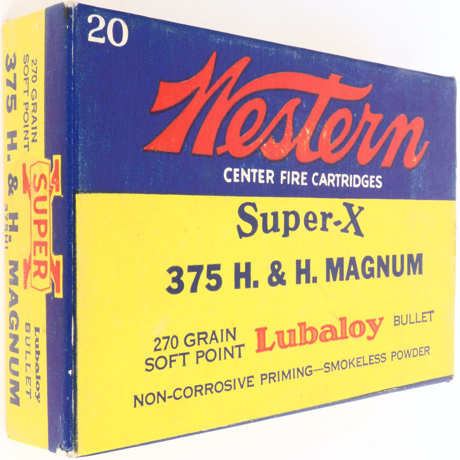 Western, Super-X, .375 H&H Magnum, 270 Grain Soft Point, Full, 1pc. Yellow blue & red box, box is solid with mint color, only very minor shelf & corner wear, edges are crisp, end flaps are solid, ammo is excellent. Grade: Excellent ++ - Value: 30 to 90