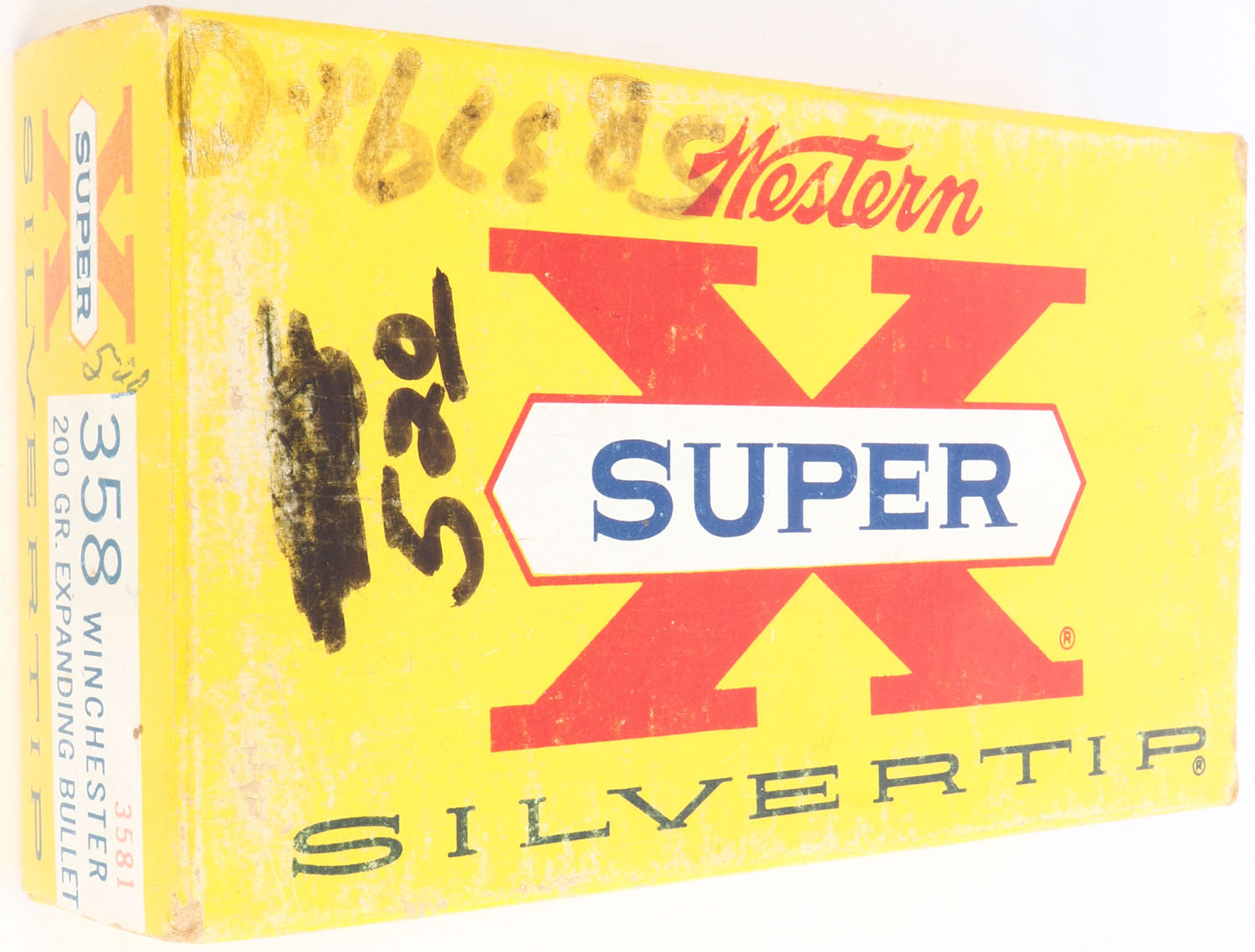 Western, Super-X Silvertip, .358 Winchester (8.8mm), 200 Grain Expanding Bullet, Full, 1pc. Yellow white & red box, box is solid with very good to excellent color, some shelf wear, top has been written on, minor corner wear, very minor edge wear, end flaps are solid, ammo is minty. Grade: Very Good ++ - Value: 20 to 60