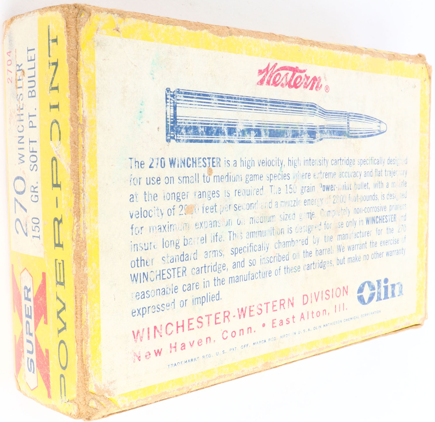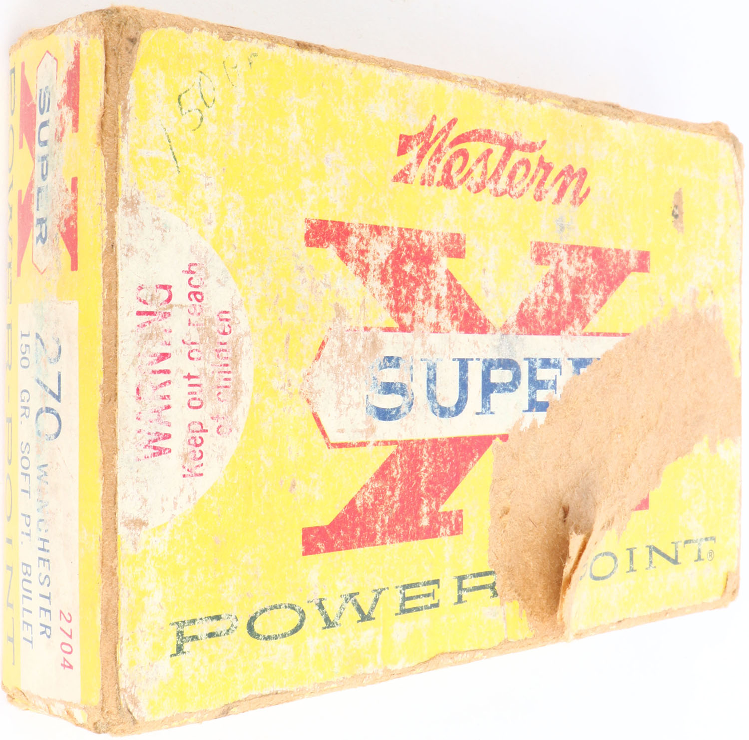 Western, Super-X Power-Point, .270 Winchester, 150 Grain Soft Point, Partial 16rds. Correct, 1pc. Yellow white & red box, box is solid with good color, heavy shelf wear, edge & corner wear, top has been written on, end flaps are solid, ammo is excellent. Grade: Good ++ - Value: 8 to 40