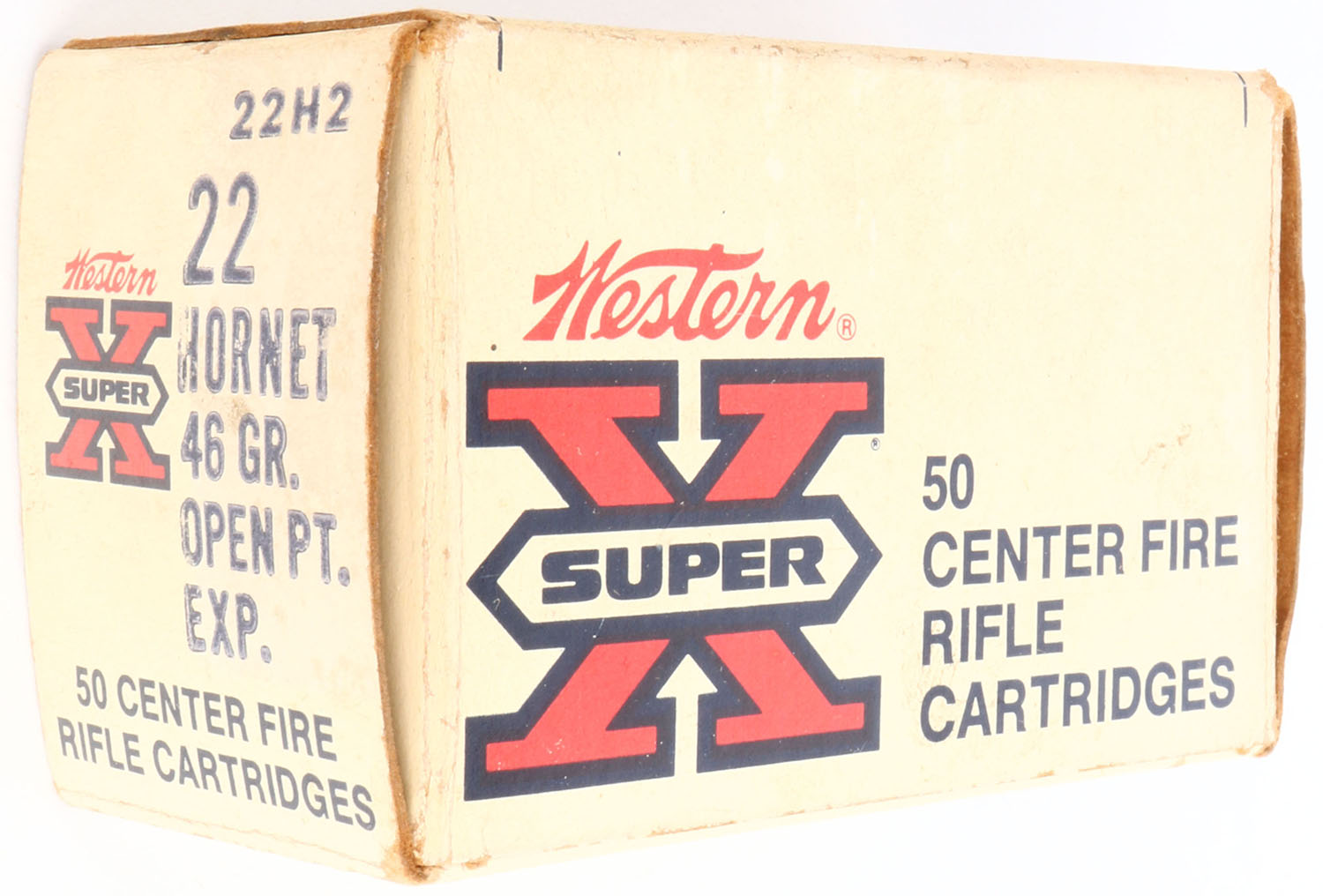Western, Super-X, .22 Hornet, 46 Grain Open Point Expanding, Full, 1pc. White & red box, box is solid with good to very good color, age soiling, very minor corner wear, edges are mostly crisp, end flaps are solid, ammo is excellent. Grade: Excellent + - Value: 30 to 90
