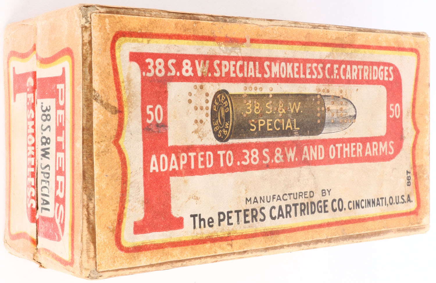 Peters, .38 Smith & Wesson Special, Smokeless, Full, 2pc. Buff box with white orange & red top & side sealing labels, box is solid with very good color, some age soiling, minor edge & corner wear, labels are intact, ammo is excellent. Grade: Excellent - Value: 30 to 90