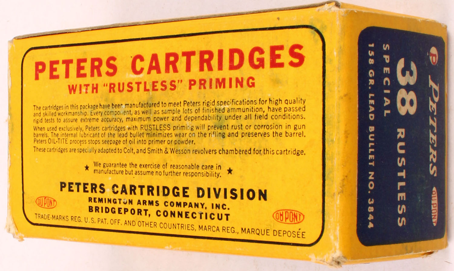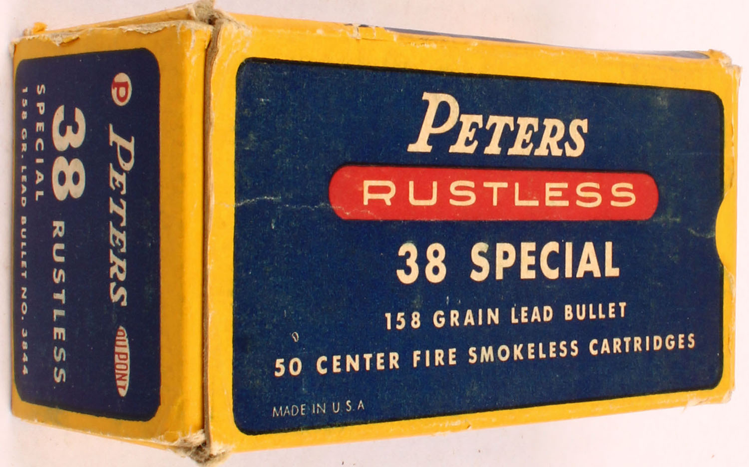 Peters, Rustless, .38 Special, 158 Gr. Lead Bullet, Full of mixed H/S, 1pc. Blue & yellow box, box is solid with excellent color, minor shelf & corner wear, very minor edge wear, end flaps are solid, ammo is excellent. Grade: Excellent - Value: 10 to 50