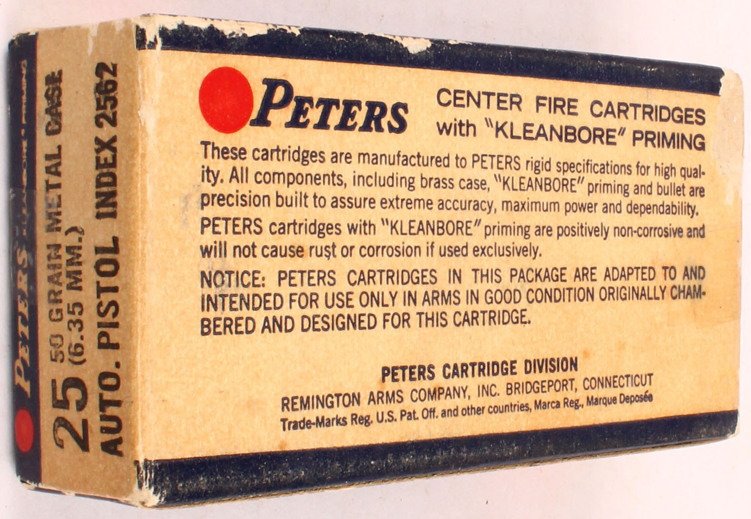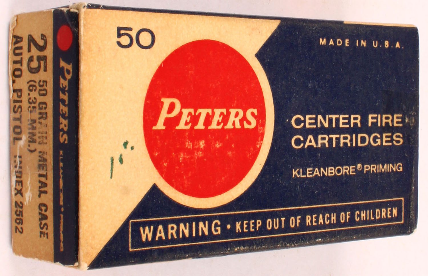 Peters, .25 Auto. (6.35mm), 50 Grain Metal Case, Full, 1pc. Blue white & red box, box is solid with very good color, some age soiling, minor corner wear, edges are mostly crisp, tape on right end, top has been written on, end flaps are solid, ammo is excellent to minty. Grade: Very Good ++ - Value: 10 to 50