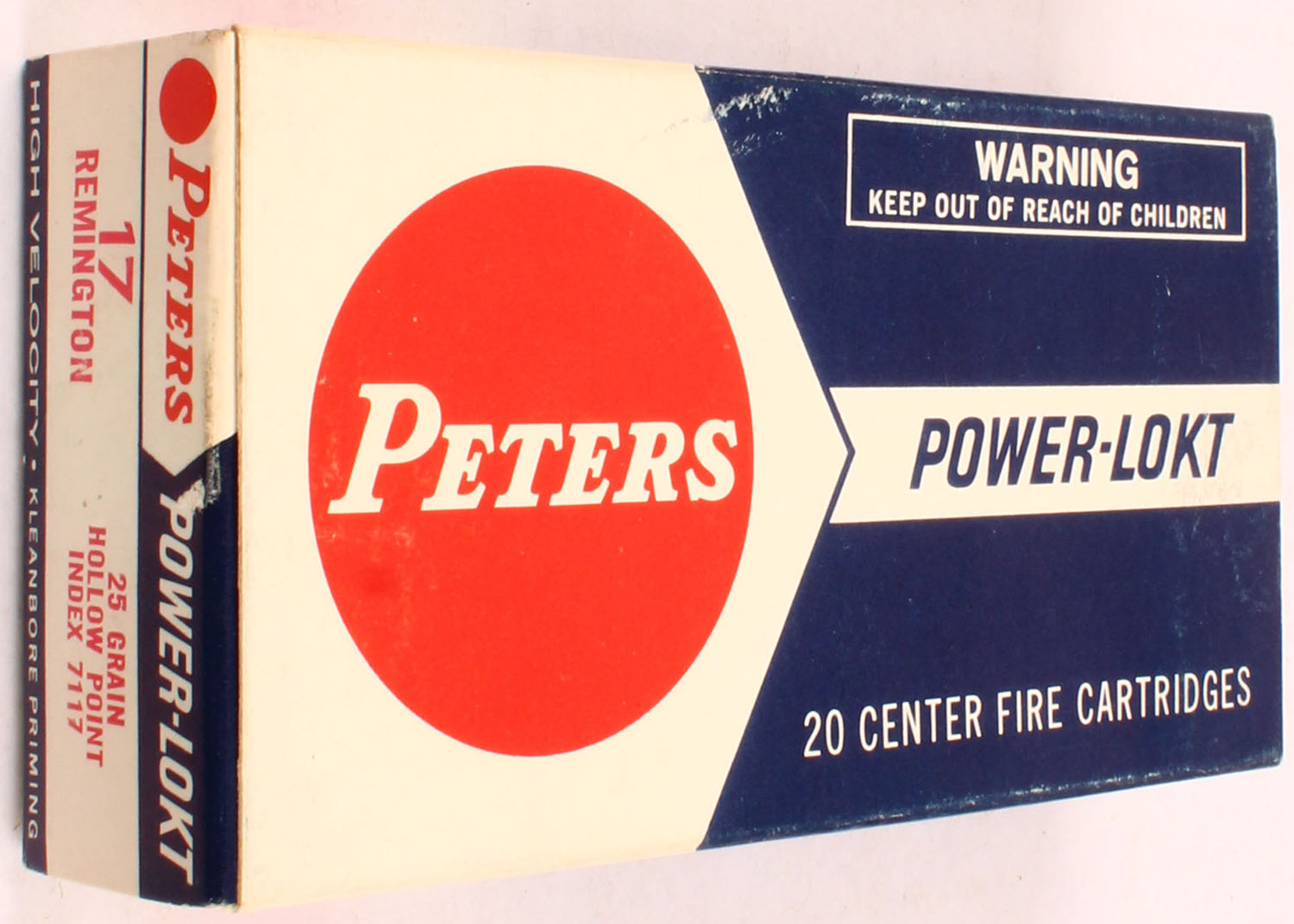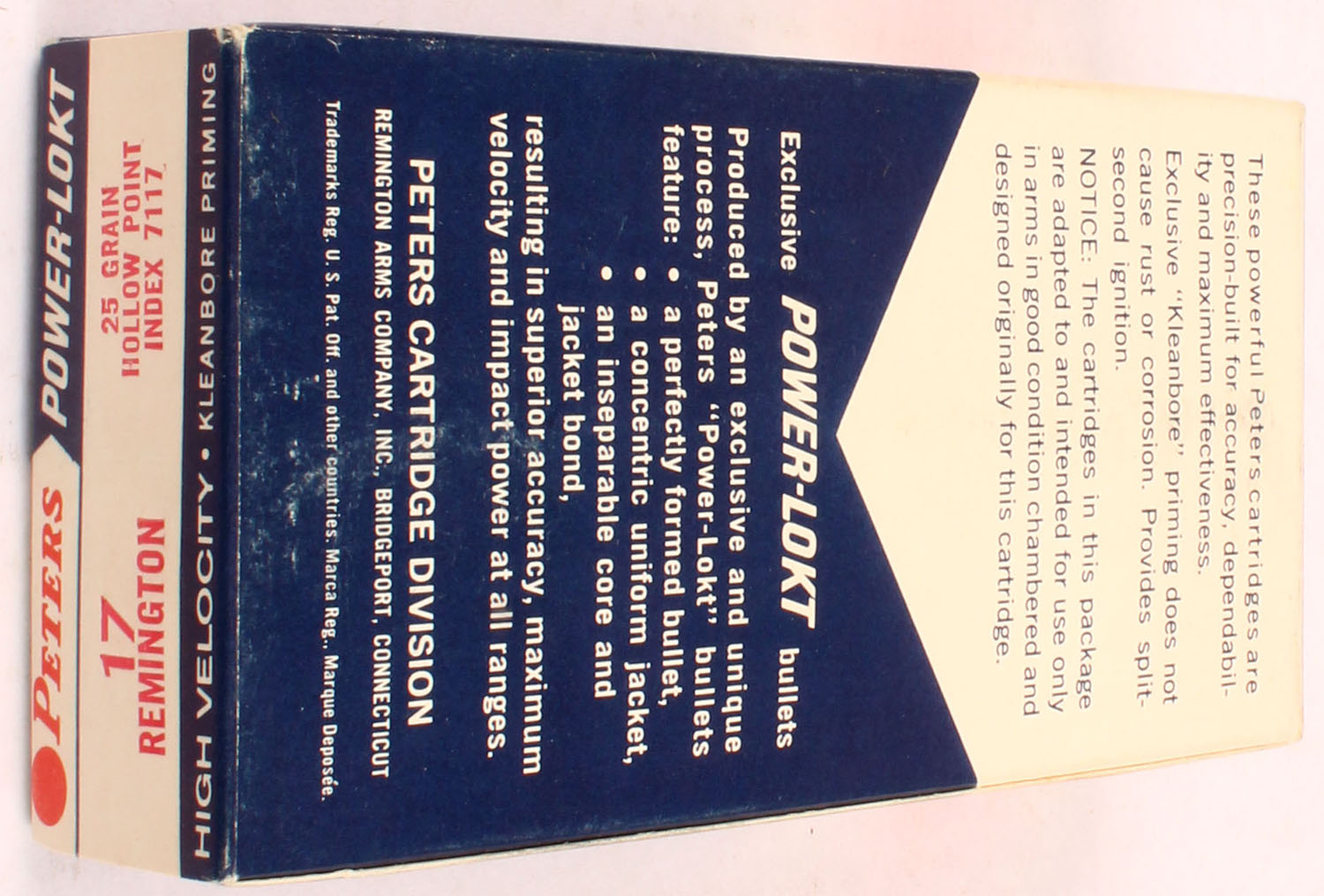 Peters, Power-Lokt, .17 Remington, 25 Grain Hollow Point, Full, 1pc. Blue white & red box, box is solid with excellent color, very minor shelf wear, corners are sharp, edges are mostly crisp, end flaps are solid, ammo is excellent. Grade: Excellent ++ - Value: 20 to 60