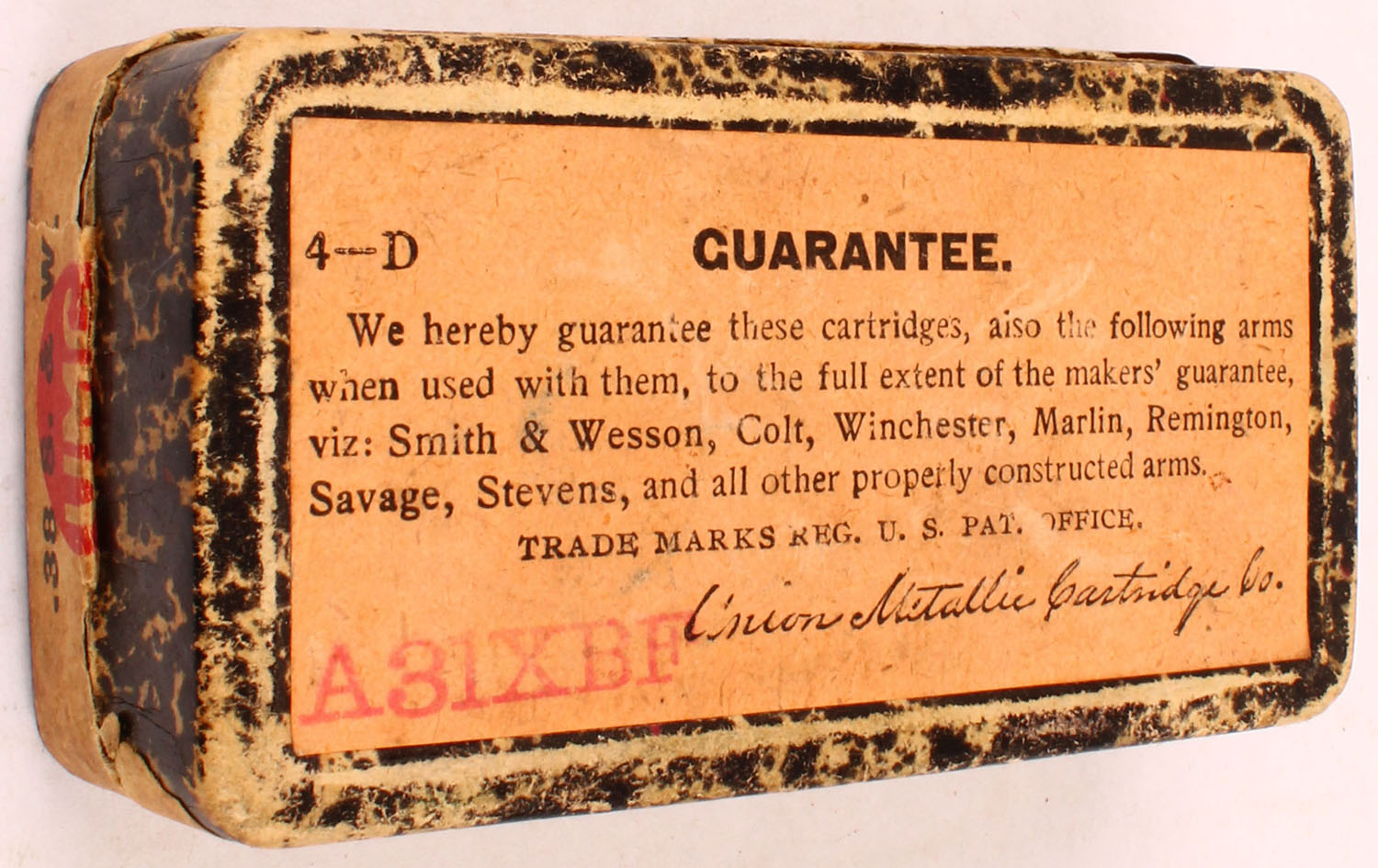 U.M.C., Central Fire Cartridges, .38 Smith & Wesson, 15 Grains Powder, 146 Grain Bullet, Partial 31rds. Correct, 2pc. Black mottled box with gray top & buff side sealing labels, box is solid with very good color, some age soiling & shelf wear, 2 vertical seam splits to left end corners of lid, edge & corner wear, side sealing label is 60% intact, ammo is excellent. Grade: Very Good - Value: 8 to 40