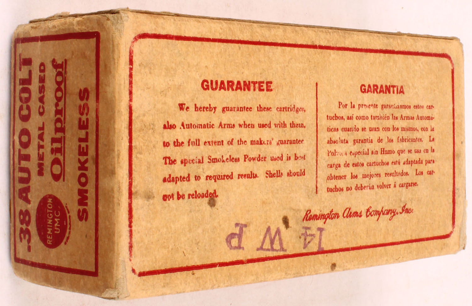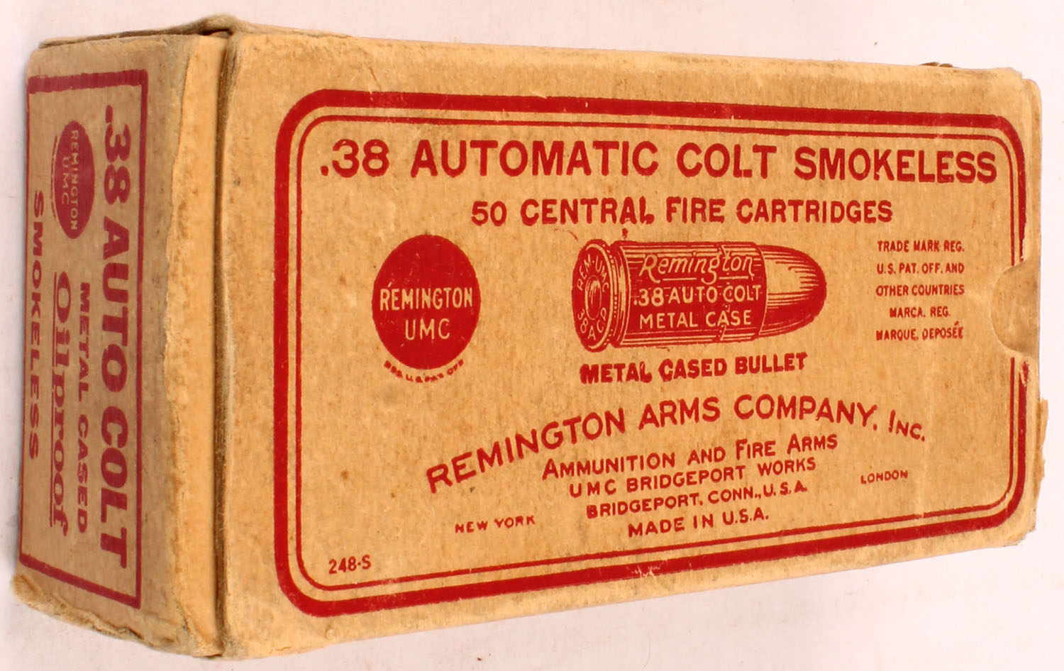 REM-UMC, .38 Automatic Colt, Metal Cased, Smokeless, Full, 1pc. Buff & red box, box is solid with very good color, some age soiling, some edge & corner wear, end flaps are solid, ammo is excellent. Grade: Excellent - Value: 20 to 60