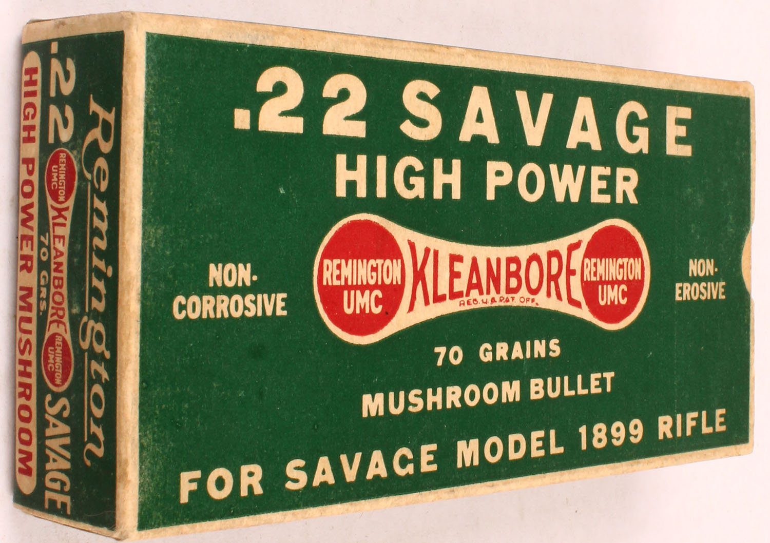 Remington, .22 Savage High Power, 70 Grain Mushroom Bullet, Full, 1pc. Green white & red dogbone box, box is solid with excellent color, very minor age soiling, corners are mostly sharp, edges are crisp, end flaps are solid, front has been written on, ammo is excellent. Grade: Excellent + - Value: 40 to 120