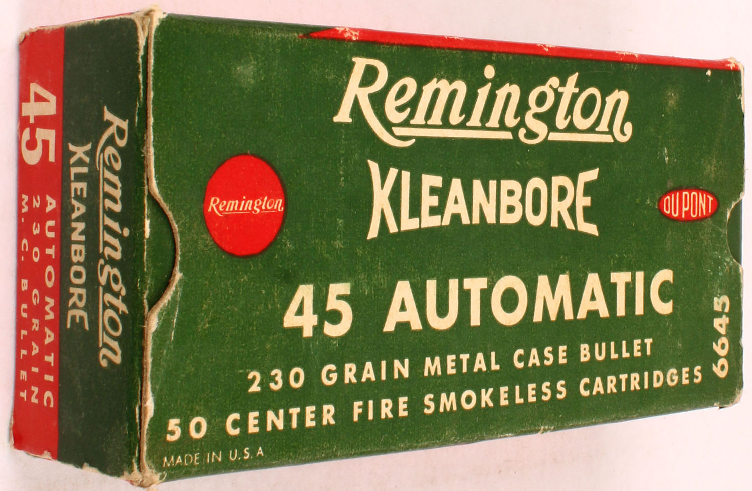 Remington, Kleanbore, .45 Automatic, 230 Grain Metal Case Bullet, Full of incorrect ammo, 1pc. Green red & white box, box is solid with excellent color, some shelf & corner wear, very minor edge wear, staining to front, end flaps are solid, ammo is excellent. Grade: Excellent - Value: 8 to 40
