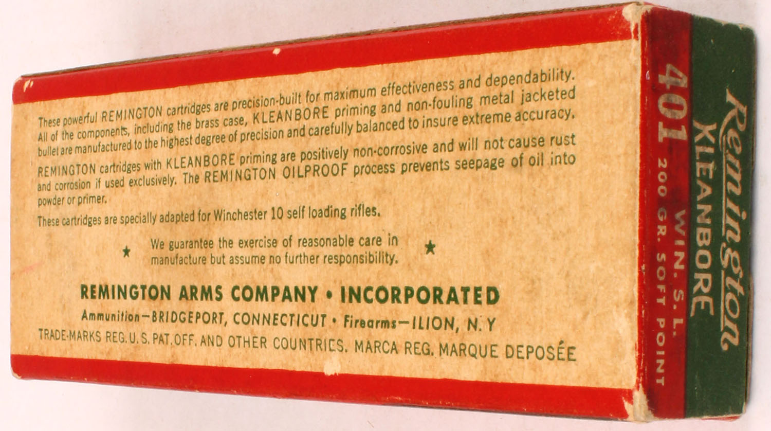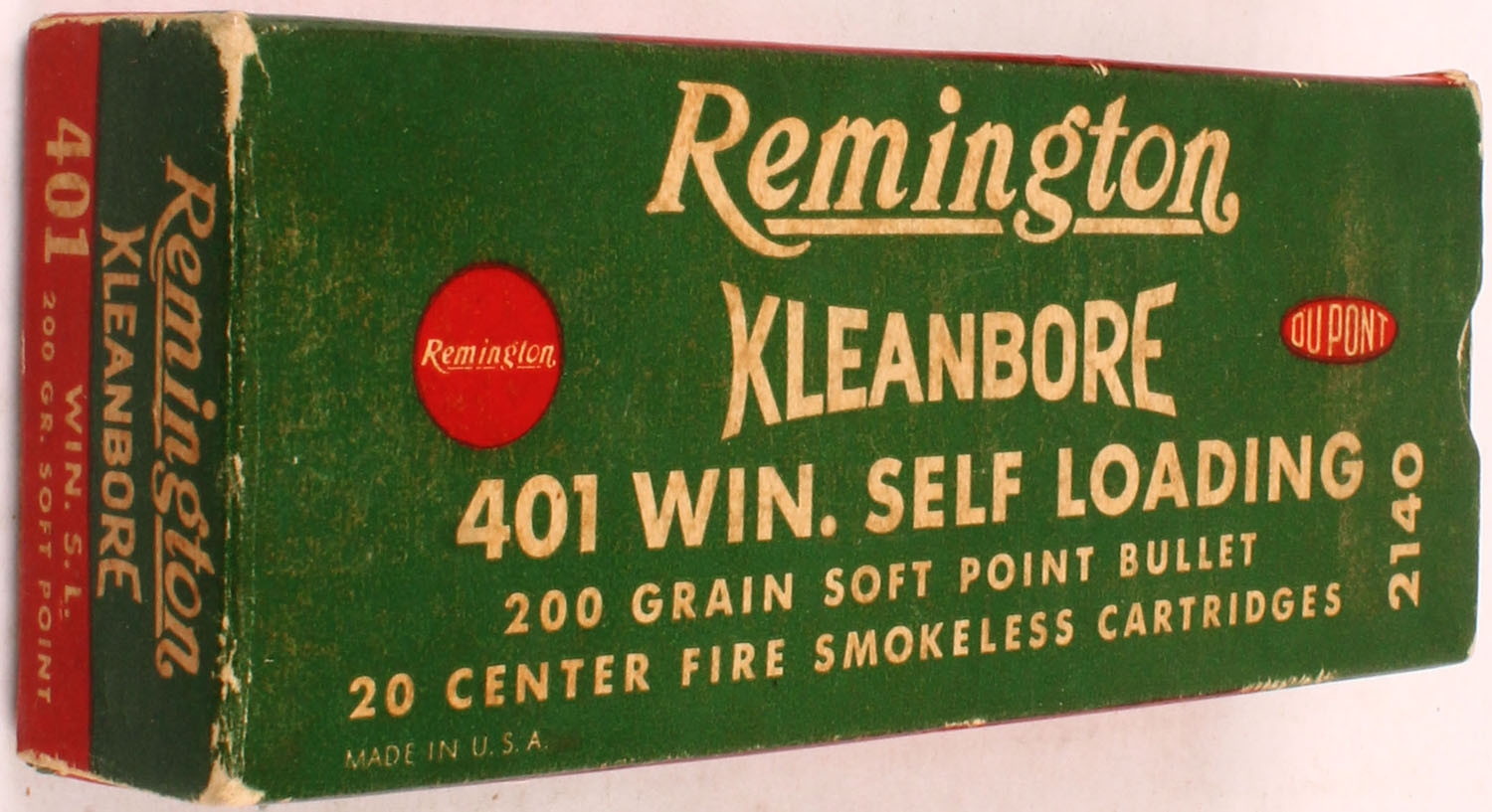 Remington, Kleanbore, .401 Self Loading, 200 Grain Soft Point, Full, 1pc. Green red & white box, box is solid with very good to excellent color, some age soiling, very minor shelf wear, minor corner wear, edges are mostly crisp, end flaps are solid, ammo is excellent. Grade: Excellent - Value: 80 to 160
