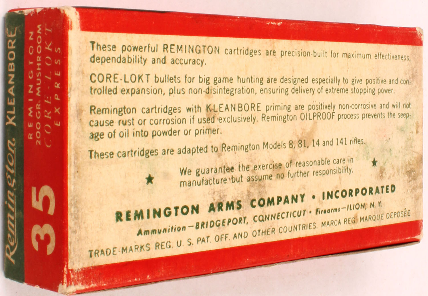 Remington, Kleanbore Express, .35 Remington, 200 Grain Mushroom Core-Lokt Bullet, Full, 1pc. Green red & white box, box is solid with excellent color, minor age soiling & shelf wear, minor corner wear, edges are mostly crisp, end flaps are solid, ammo is excellent. Grade: Excellent + - Value: 30 to 80