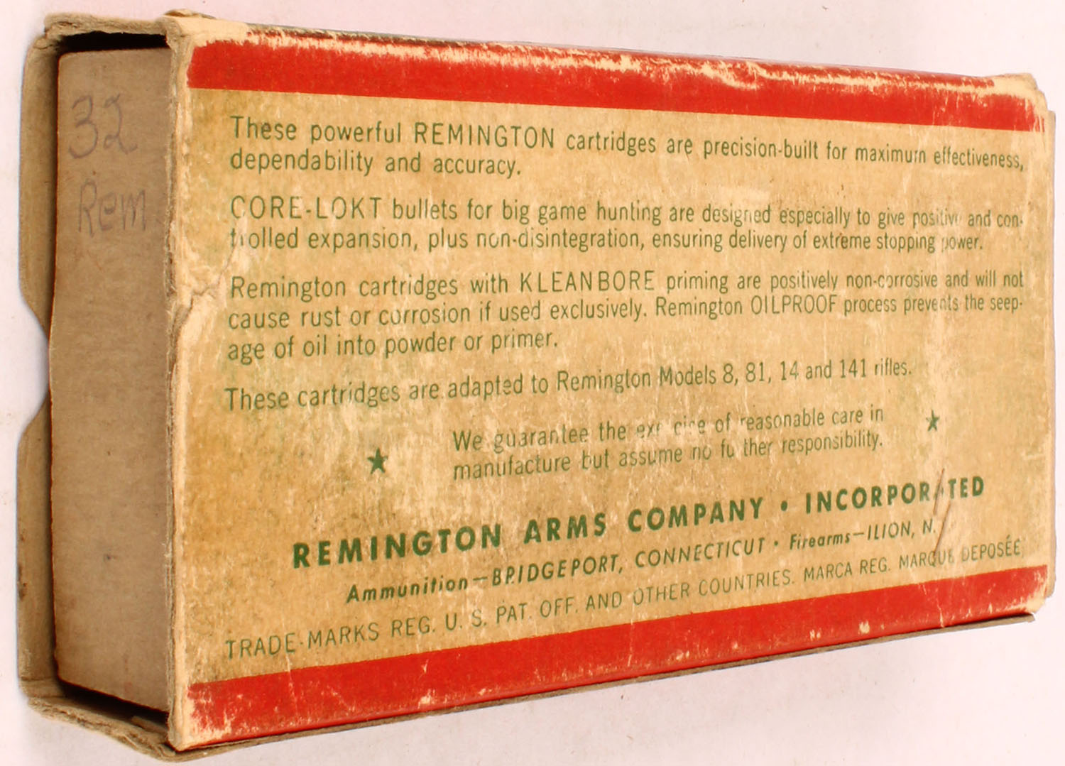 Remington, Kleanbore Express, .32 Remington, 170 Grain Mushroom Core-Lokt Bullet, Full, 1pc. Green red & white box, box is missing both end flaps, very good color, some age soiling & shelf wear, edge & corner wear, top has been written on, ammo is excellent. Grade: Good ++ - Value: 8 to 40