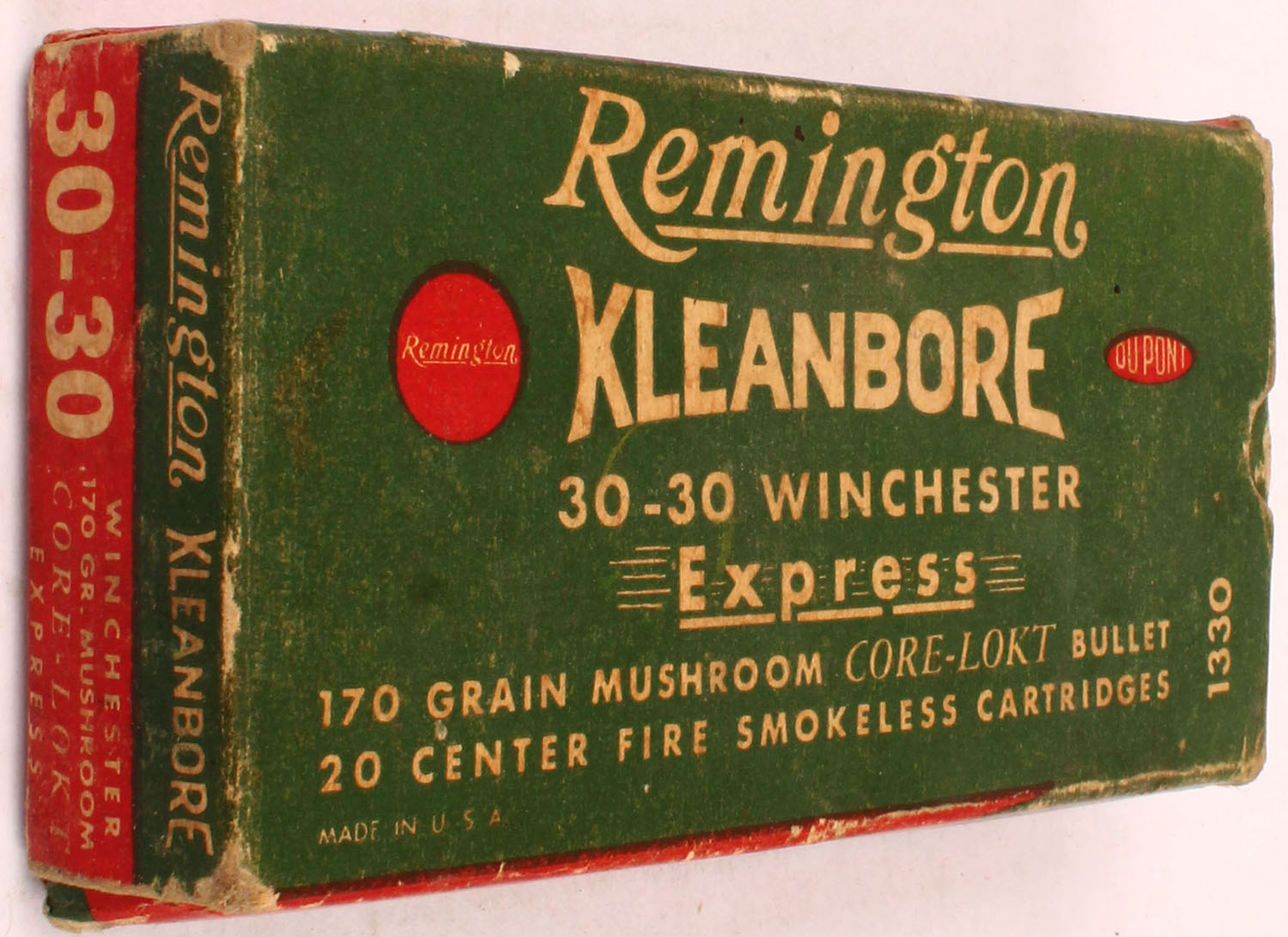 Remington, Kleanbore, .30-30 Winchester Express, 170 Gr. mushroom Core-Lokt bullet, 1pc, Full with one Incorrect H/S, Green/red box with white print, box has partial seam tear in right end flap, one inside flap on right end missing, factory glued seal has come undone, light pen marks on right end flap, age soiling, light rub marks, & light edge wear, ammo is Full. Grade: Very Good - Value: 20 to 60