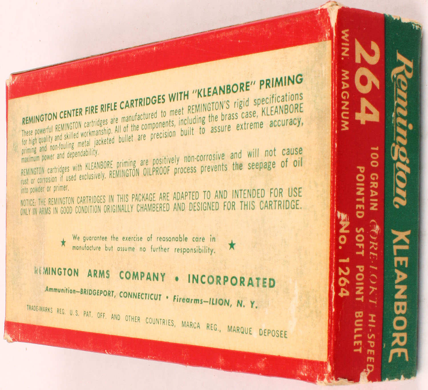 Remington, Kleanbore, .264 Winchester Magnum Hi-Speed, 100 Gr. Pointed Soft Point Core-Lokt bullet, 1pc, Full, Green/red box with white print, box is solid with two inside end flaps detached, rub marks, edge/corner wear, & light age soiling on bottom, ammo is excellent. Grade: Very Good ++ - Value: 30 to 60