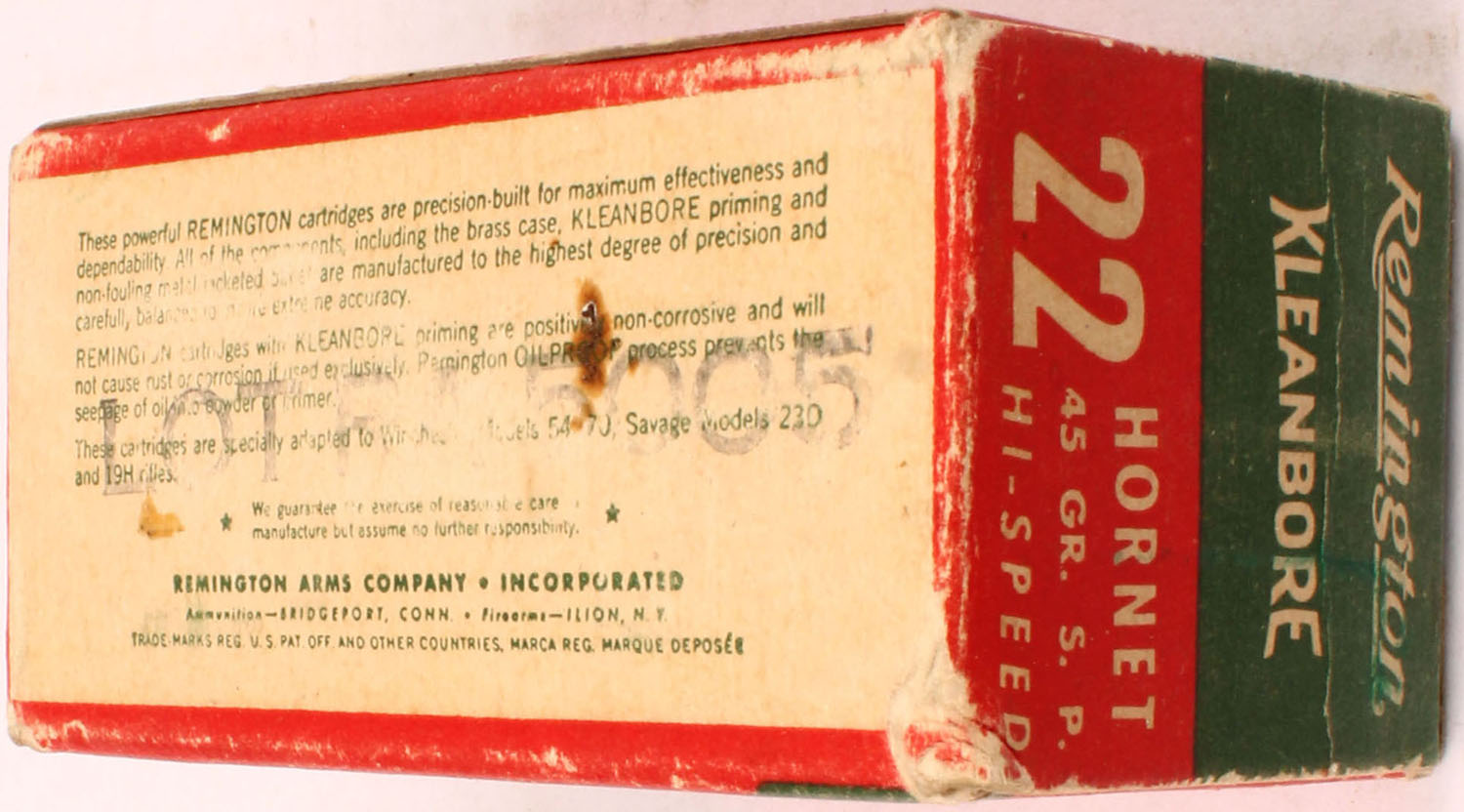 Remington, Kleanbore, .22 Hornet Hi-Speed, 45 Gr. Soft Point bullet, MILITARY MARKED BOX, ''LOT RA 5005'', stamp is faint but still present, 1pc, Full, Green/red box with white print, box is solid with rub marks, light edge/corner wear, & pen marks on side, ammo is excellent. Grade: Very Good ++ - Value: 50 to 100