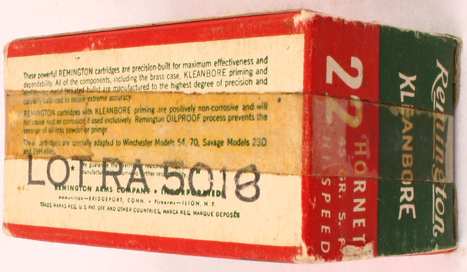 Remington, Kleanbore, .22 Hornet Hi-Speed, 45 Gr. Soft Point bullet, MILITARY MARKED BOX, ''LOT RA 5018'', 1pc, Full, Green/red box with white print, box is solid with tape across box, sticker marks on sides, light rub marks, & light edge wear, ammo is excellent. Grade: Excellent - Value: 50 to 100