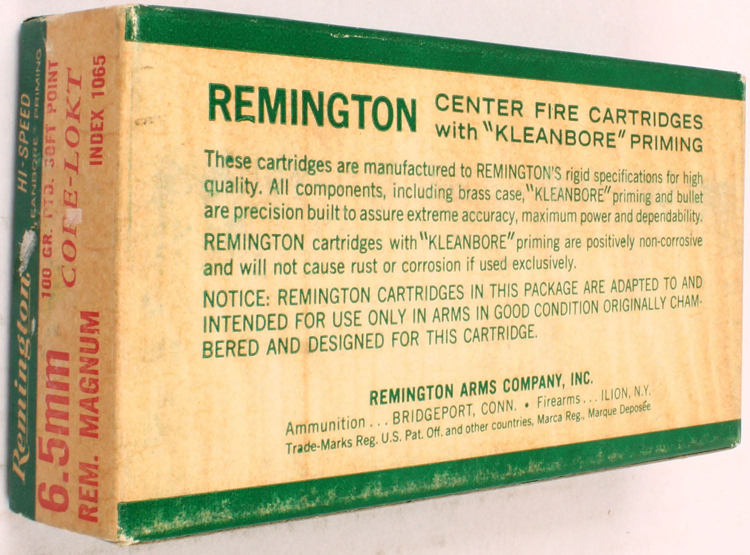 Remington, 6.5 Rem. Magnum Hi-Speed, 100 Gr. Pointed Soft point Core-Lokt Bullet, 1pc, Full, Green/white box with red/white print, box is solid with rub marks, label tears marks, & tape, ammo is excellent. Grade: Very Good + - Value: 30 to 60