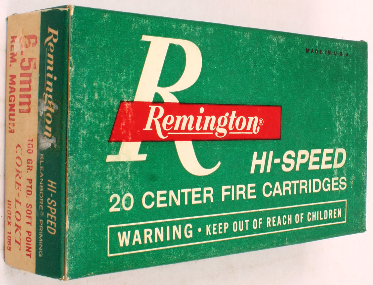 Remington, 6.5 Rem. Magnum Hi-Speed, 100 Gr. Pointed Soft point Core-Lokt Bullet, 1pc, Full, Green/white box with red/white print, box is solid with rub marks, label tears marks, & tape, ammo is excellent. Grade: Very Good + - Value: 30 to 60