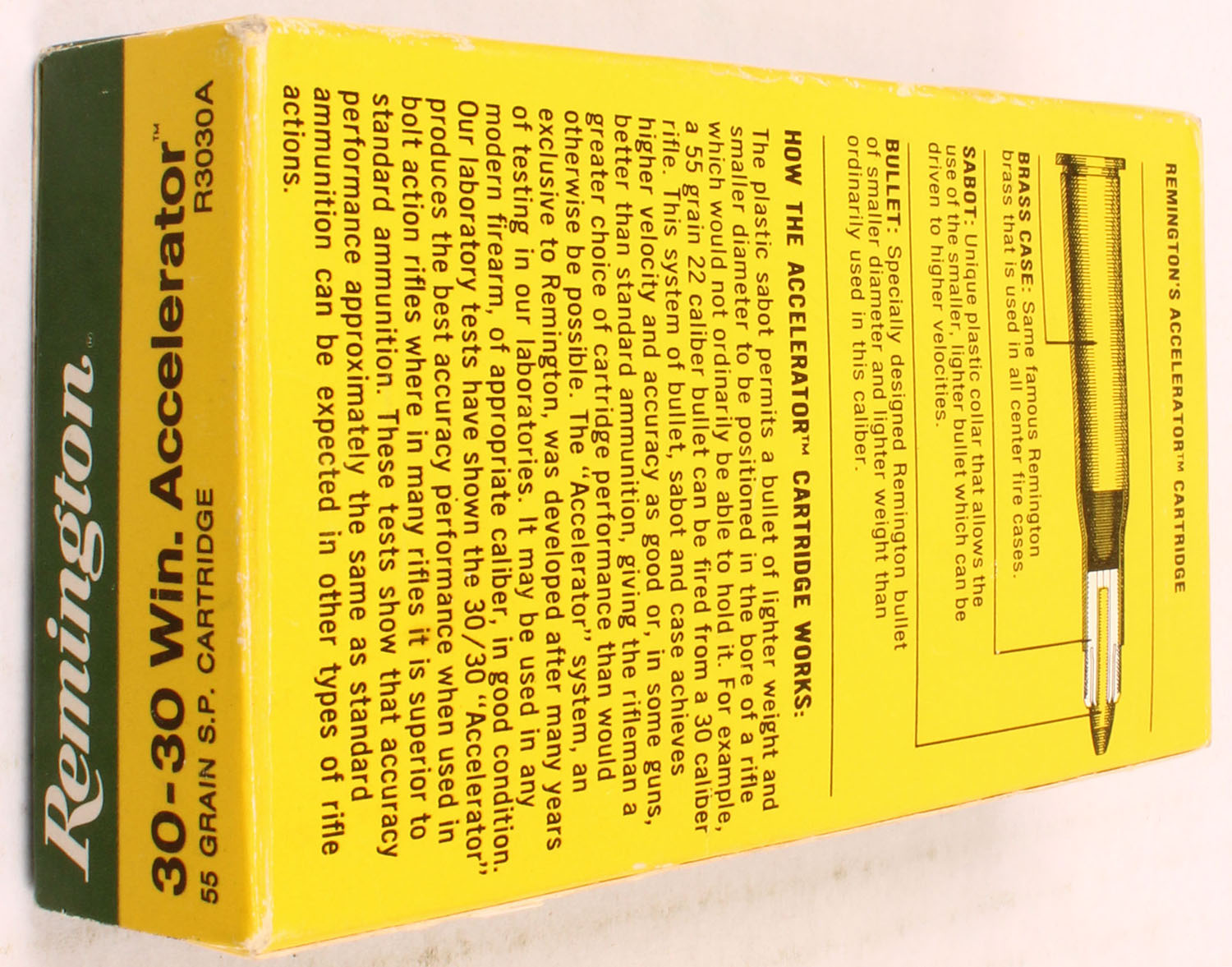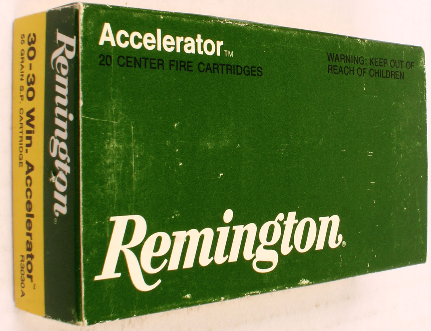 Remington, Accelerator, .30-30 Win., 55 Gr. Soft Point Bullet, 1pc, Full, green/yellow box with white/black print, box is solid with rub marks, ammo is Excellent. Grade: Excellent - Value: 30 to 60
