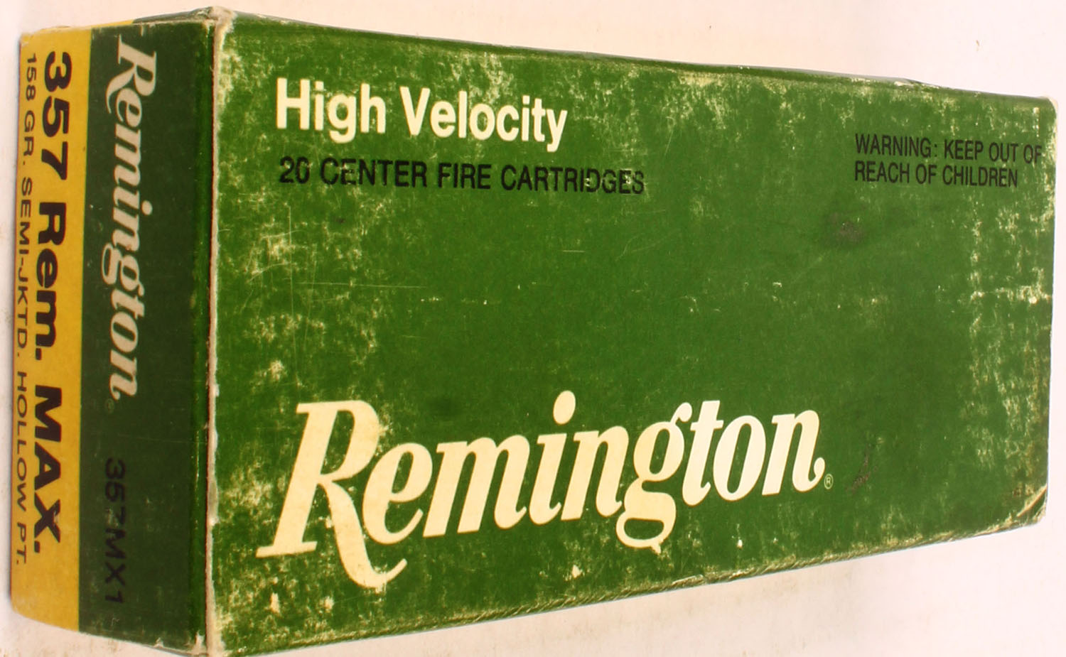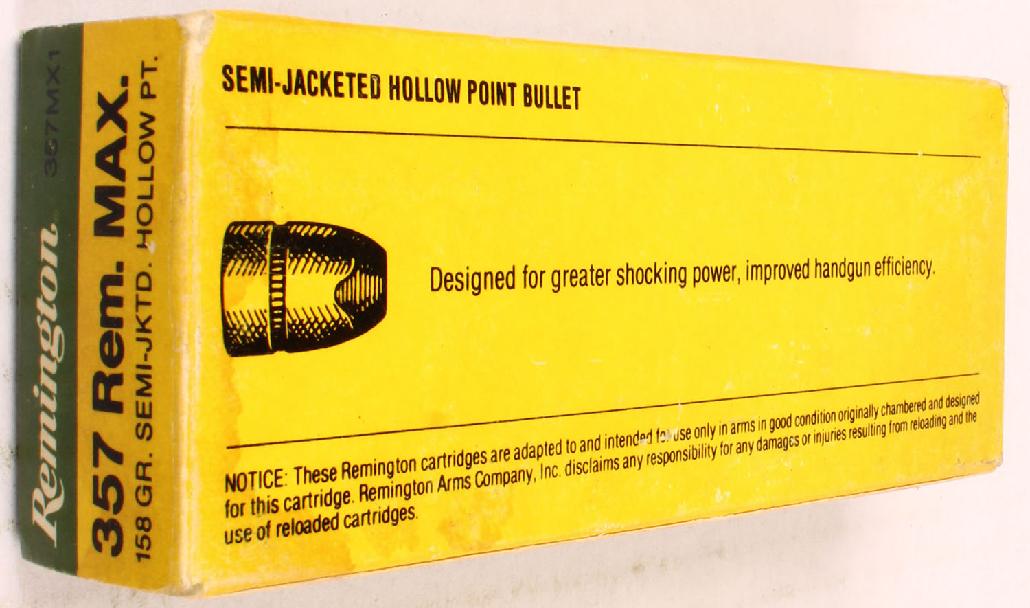 Remington, High Velocity, .357 Rem. Max., 158 Gr. Semi-JKTD Hollow PT., 1pc, Full, green/yellow box with white/black print, box is solid with rub marks, ammo is Excellent. Grade: Excellent - Value: 20 to 40