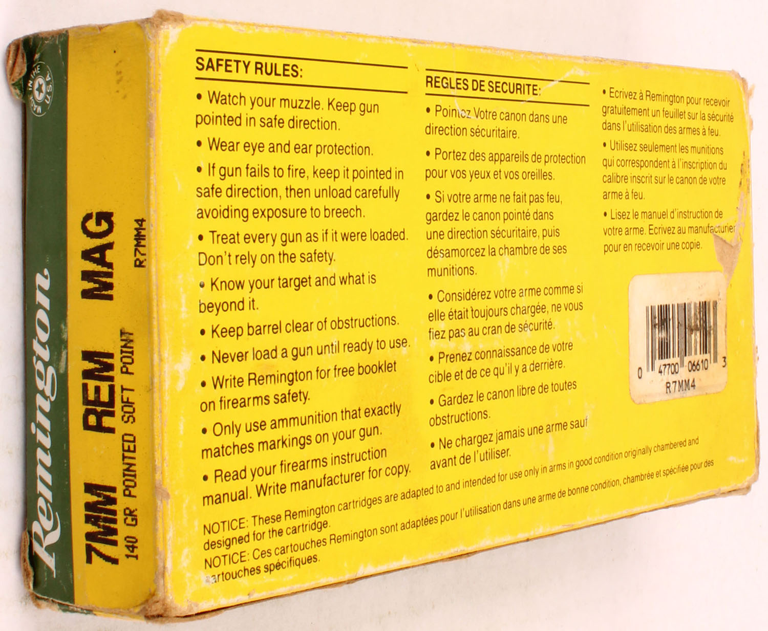 Remington, High Velocity, 7mm Rem Mag, 140 Gr. PTD soft point bullet, 1pc, Full, green/yellow box with white/black print, box is solid with rub marks, ammo is Excellent. Grade: Excellent - Value: 30 to 60