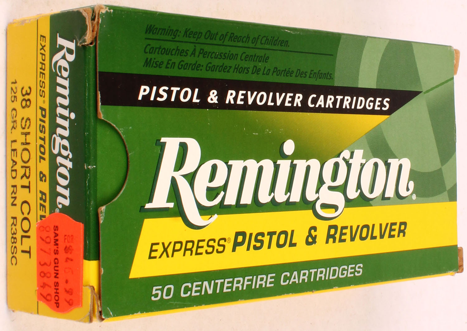 Remington, Express, .38 Short Colt, 125 Gr. Lead Rn Bullet, green/yellow box with white/black/green print, box is solid with light wear, ammo is excellent. Grade: Excellent - Value: 40 to 80