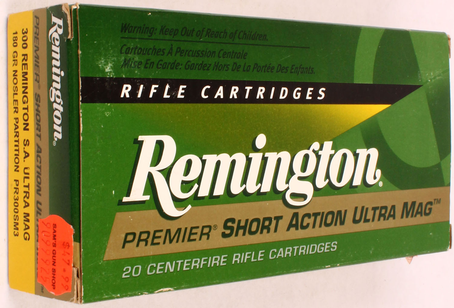 Remington, Premier, .300 Remington S.A. Ultra Mag, 180 Gr. Nosler Partition Bullet, green/yellow box with white/black/green print, box is solid with light wear, ammo is excellent. Grade: Excellent - Value: 40 to 80